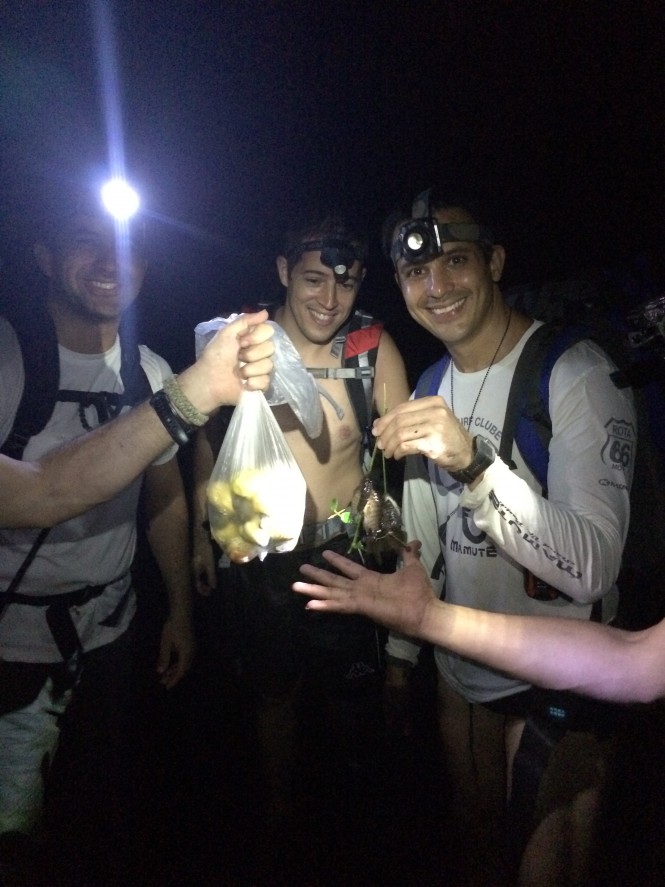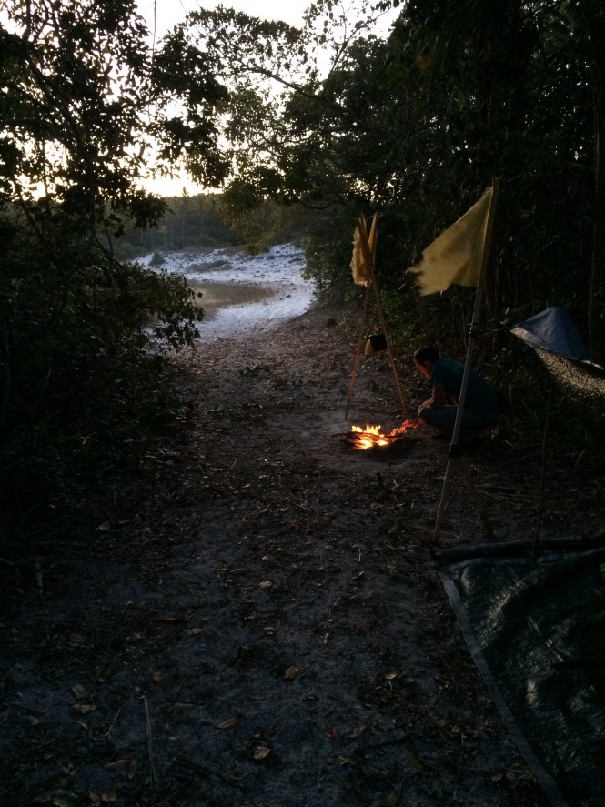 Alguns se animaram e acenderam uma fogueira com glicerina e permanganato para esquentar comida. Eu estava satisfeito com os cajus que comi no caminho.
