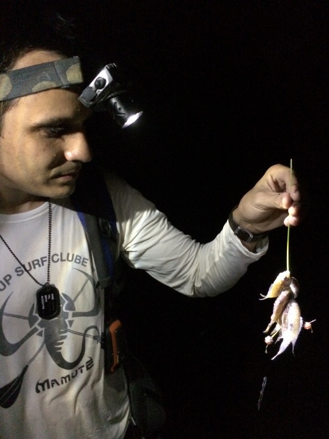 Depois de 30 minutos de caminhada eu, Lucas e Israel resolvemos esperar pelos demais que ficaram para trás. Como estávamos num local em que um brejo havia alagado a trilha, aproveitamos as lanternas para pescarmos algumas piabas. Ofuscadas pela luz elas eram pegas na mão. Serviriam de isca no dia seguinte. Lucas foi o campeão absoluto da pescaria.