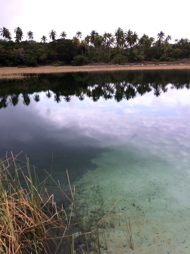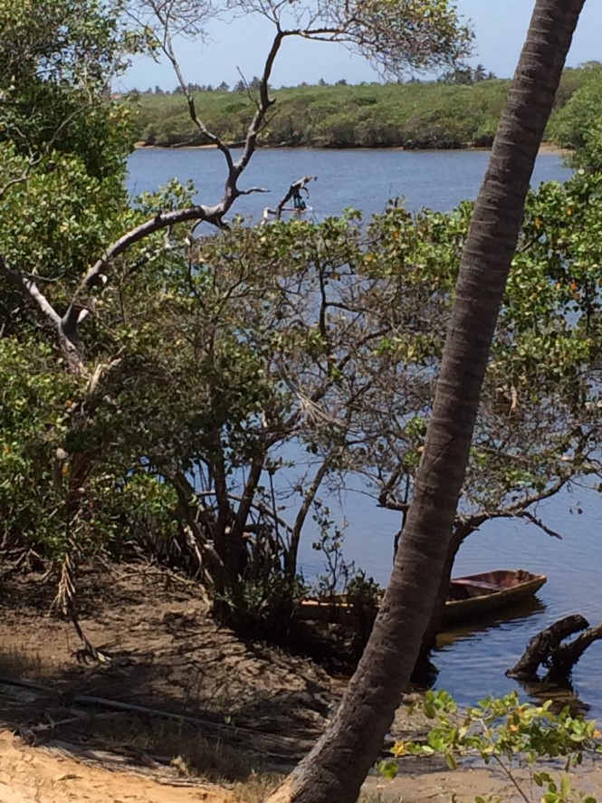 Depois do snorkel, eu e Alberto saímos para coletar cocos e cajus. Na outra margem da lagoa se avistava as ruínas de uma casa, no meio de um coqueiral, habitada até os anos 90 pelo antigo proprietário daquelas terras. Passamos perto dela na noite anterior, mas não a vimos no meio da vegetação.