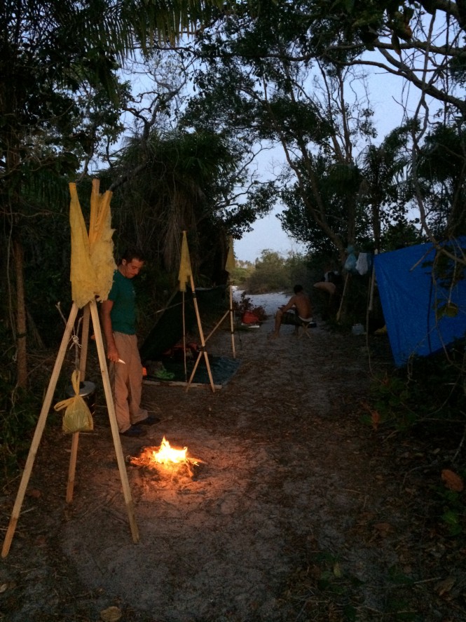 Cada um montou seu abrigo. Novamente apenas joguei na areia o meu isolante e saco de bivaque. O pessoal aproveitou novamente as varetas das bandeirolas para fazer seus abrigos e o suporte das panelas nas fogueiras. O pessoal zoou com Filipe pois ele parecia que tinha montado uma tenda de torneio medieval porque as bandeirolas estavam ainda panejando. Alberto resolveu fazer uma cama suspensa com paus e a corda que havia trazido. Não levei fé na cama, achava que o peso faria tudo desabar. Mas não é que deu certo!