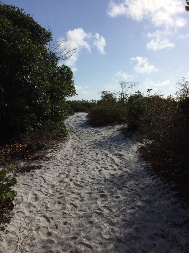 Era até melhor ficar sem lanterna pela beleza do lumiar na vegetação e para acostumar os olhos a escuridão. A vegetação ao lado da trilha era predominante bosque de restinga. Arbustos, palmeiras, mangabeiras, cajueiros e árvores pequenas nativas.