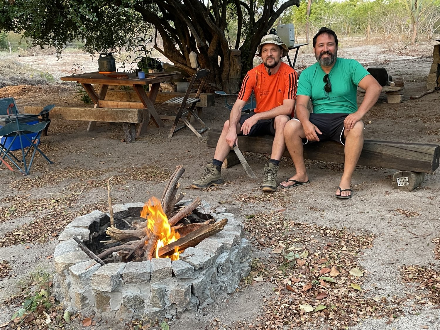 Visual do sítio. Beto e Ernani diante da fogueira esperando a brasa para iniciar o churrasco.