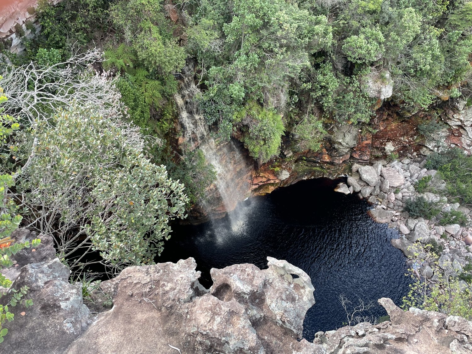 Ao final do percurso pelo leito do rio chegamos no ponto onde caía a Herculaninho. Na foto abaixo a beirada da queda. Lá embaixo, o poção.