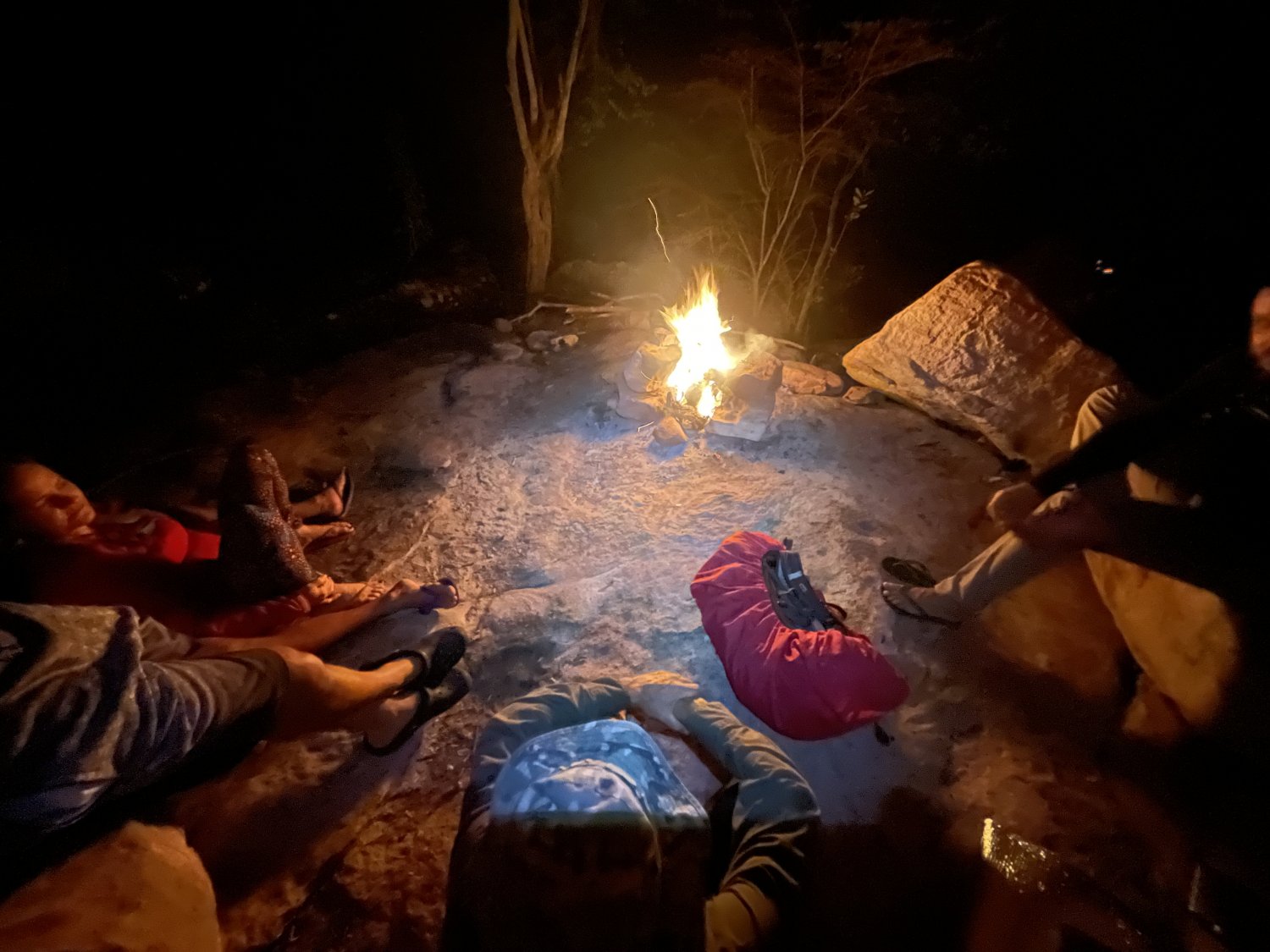 Teve um momento que choveu e nos abrigamos na toca onde acendemos outra fogueira e continuamos a conversa. Falando mal de quem não veio (quem mandou não vir?).