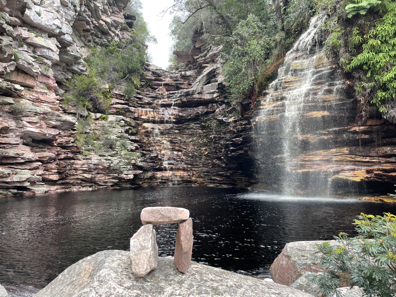 Quando a chuva passou bateu um desânimo. Eu e Lucas já conhecíamos o poção. Apenas Beto e Samuel estavam com disposição para prosseguir até o fundo do cânion, ao pé da cachoeira. Lucinha resolver acompanhar o marido. Eu, Lucas e Igor ficamos descansando e tomando um café. As pedras estavam bem escorregadias devido à chuva. Eu considero leito de rio empedrado (pula pedra) o pior terreno para trilhar. Para ter um acidente é fácil, além de forçar bem o joelho e ser muito cansativo.