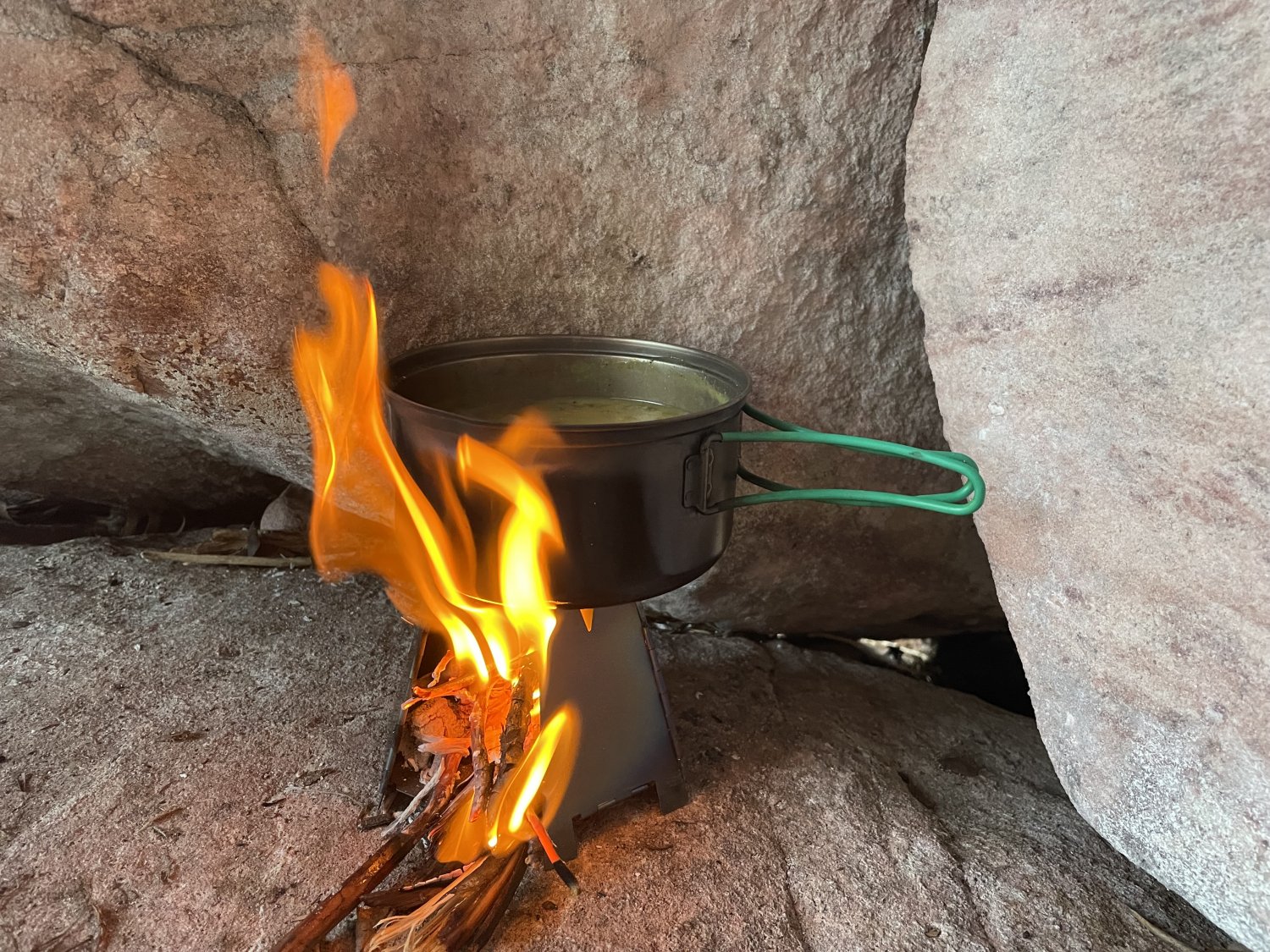 Armadas as barracas, jantamos. Eu usei meu fogareiro de gravetos para fazer um risoto pré-pronto (fervura + 12 minutos).
