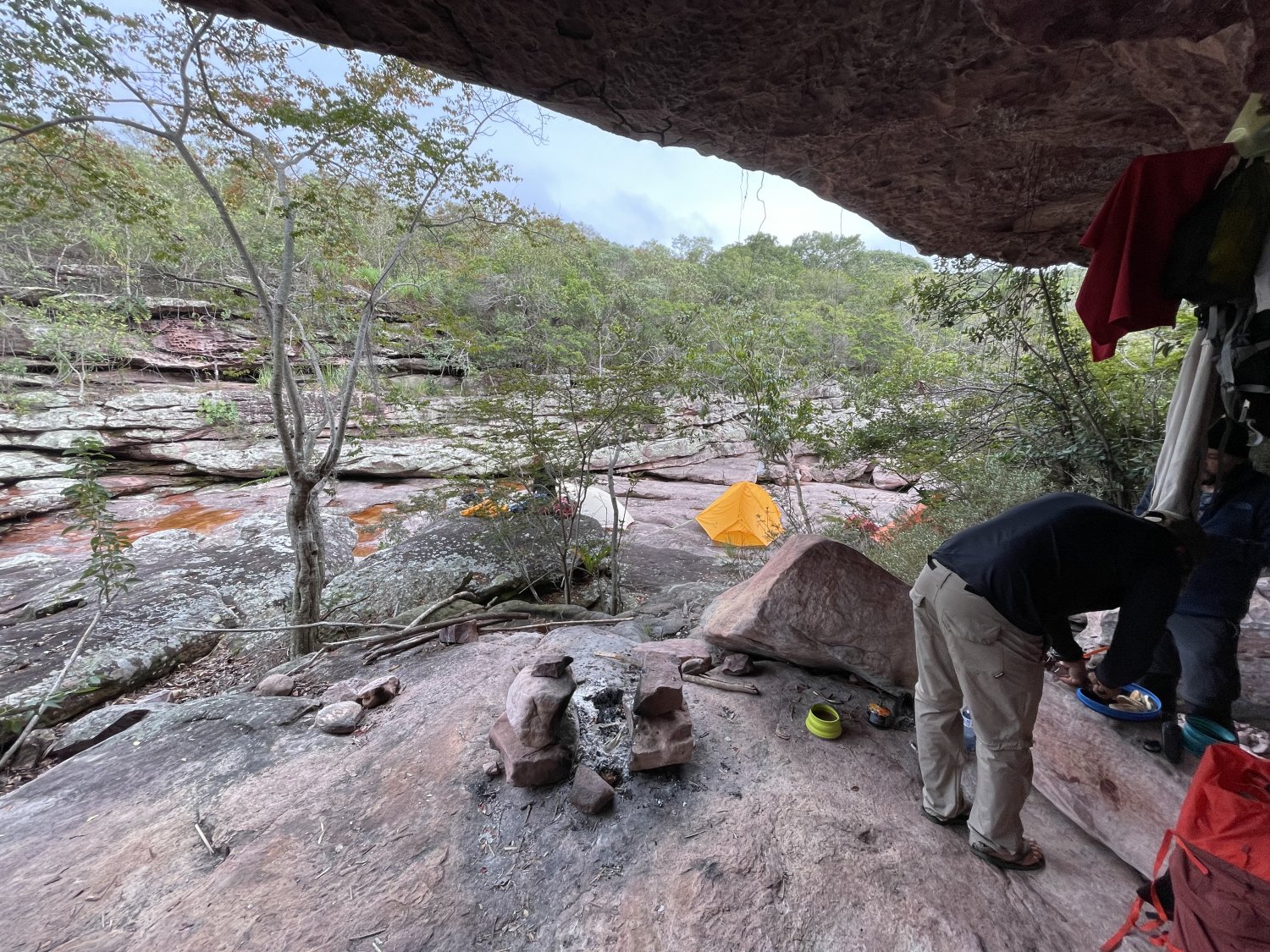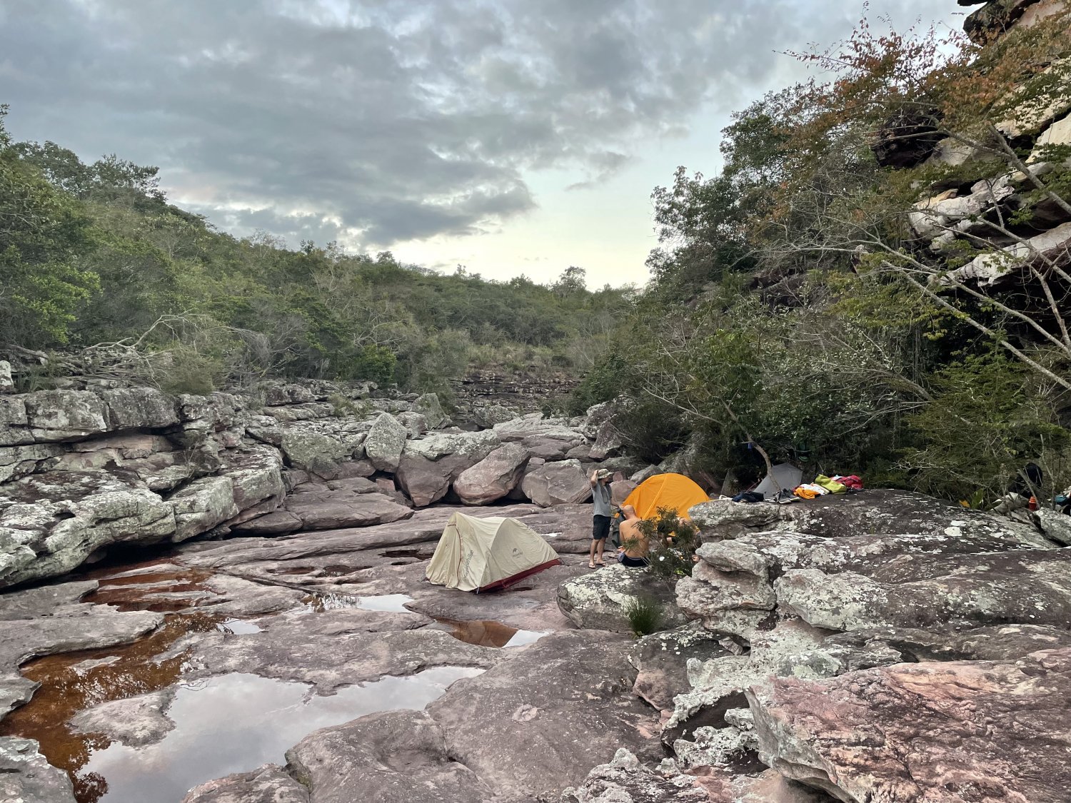Num trecho, Lucas, nosso guia, adiantou e descobriu uma toca maravilhosa com um pouco de água corrente na frente. Como o rio tinha pouca água, havia lajeados no leito onde se podia montar tendas autoportantes. Eu, com uma Lanshan 1 (não autoportante), optei por bivacar dentro da toca (possuía um saco de bivaque) sem usar a tenda.