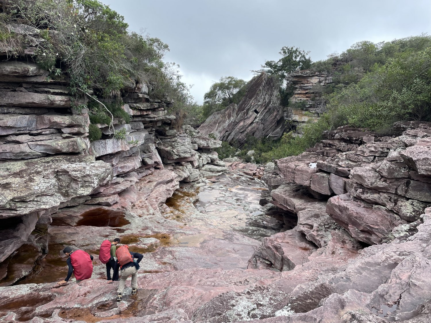 Após cerca de hora e meia chegamos a uma fenda que descia até o fundo do cânion da Herculano. Fenda fácil. Chegamos no leito do rio e num trecho seguimos pela margem direita verdadeira para logo ter que pular pedra. Já perto do poção da Herculano nos abrigamos debaixo de uma árvore devido a uma chuva grossa. Puxamos das mochilas os sobretetos das tendas para nos proteger.