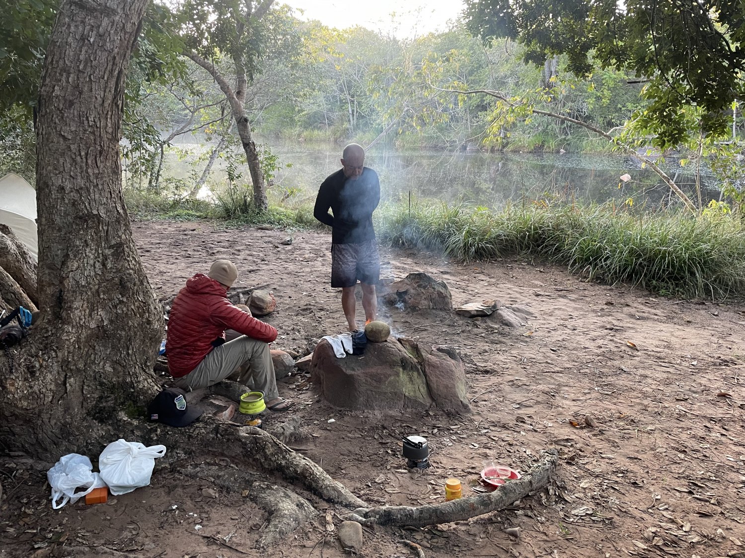 O pessoal acordou cedo, por volta de 06 horas. Me levantei quando notei que era o último deitado. Não houve condensação no saco de bivaque.