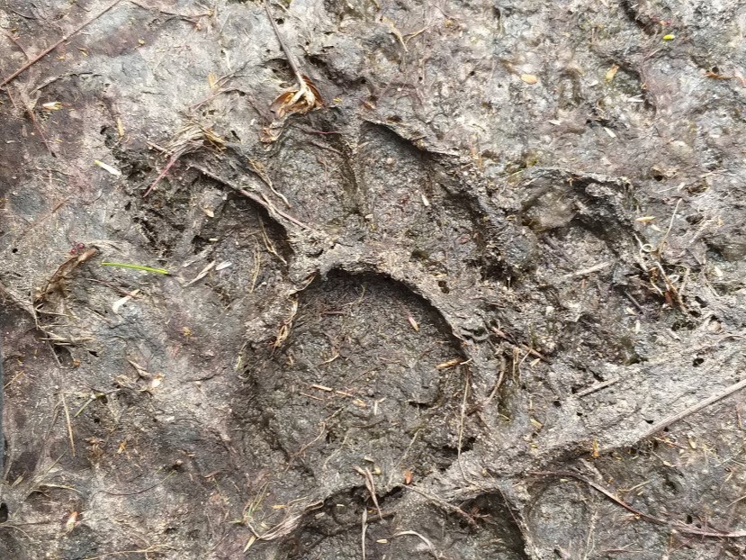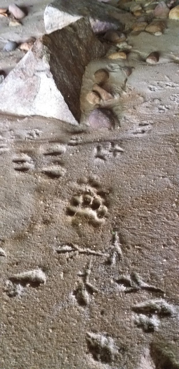 Nesta passagem havia um chão arenoso. Nele, era incrível a quantidade de pegadas de animais diferentes. O guia reconheceu uma de irara (Eira barbara) e uma de paca.