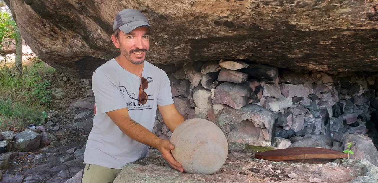 Encontramos ferramentas de garimpeiros e uma pesada bola de rocha perfeitamente esférica, cinzelada naturalmente pela correnteza do rio Paraguaçu. Imaginamos o trabalho de Sísifo que os garimpeiros tiveram para trazê-la do leito do rio lá embaixo até a toca, centenas de metros acima.