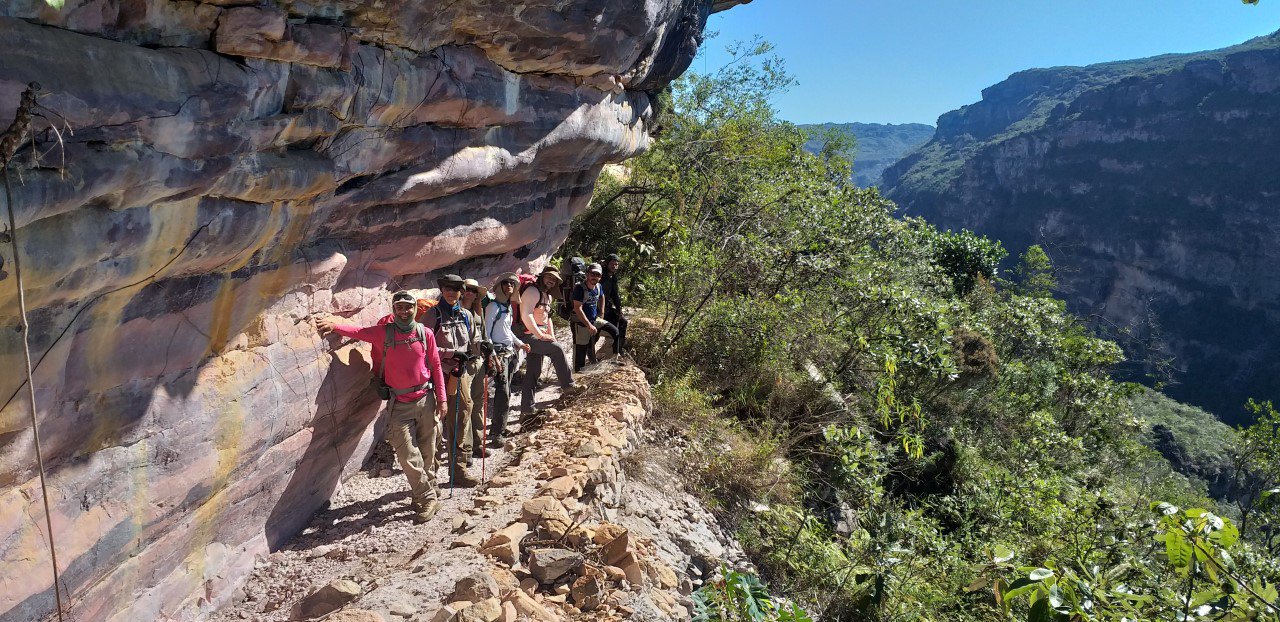 Após a visita o objetivo era descer até o rio Paraguaçu e avançar pelo seu leito até o próximo acampamento. Percorremos a borda por mais algum tempo até chegarmos ao início da Rampa do Sal. Descida maravilhosa, mostrando a engenharia dos garimpeiros. A trilha bordejava o precipício em vários pontos.