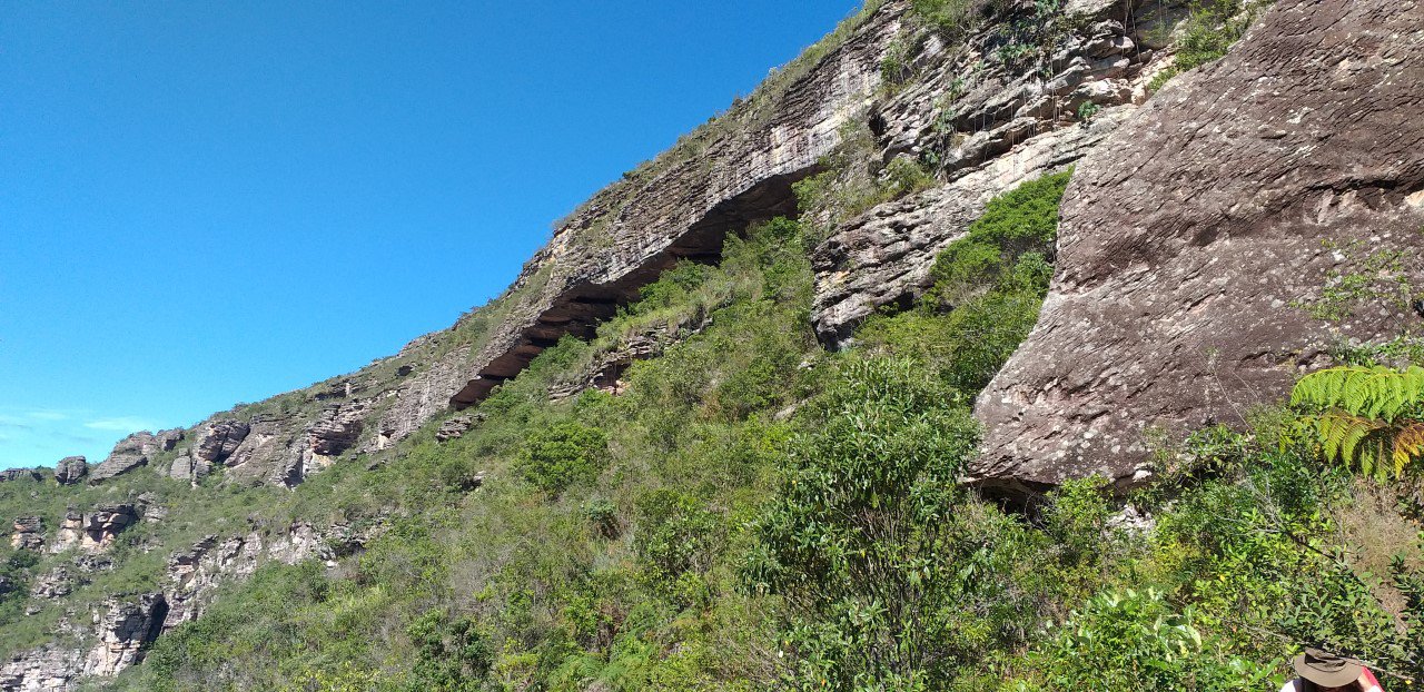 Lapa enorme, visualizada no centro da imagem (fenda escura). A foto foi tirada após passarmos por ela, enquanto descíamos.