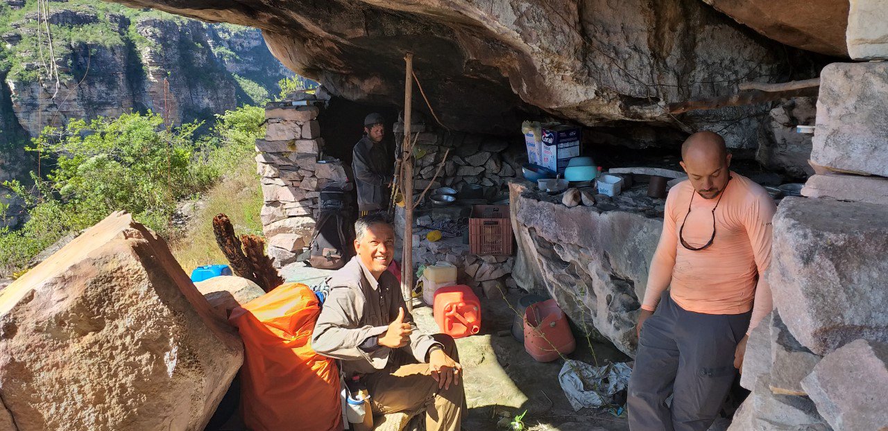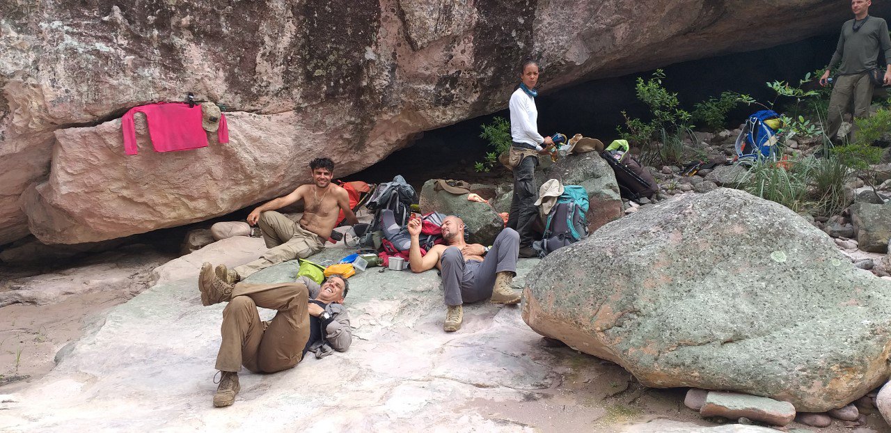 Chegamos na toca do Alemão, onde um estrangeiro investiu na exploração de diamante. Ali seria a descida final para o Paraguaçu. Joaab e Edilande procuraram uma descida alternativa para o rio. A que ele conhecia estava fechada pela mata. Tivemos que esperar duas horas na toca, resenhando, enquanto eles lutavam para achar um caminho viável.
