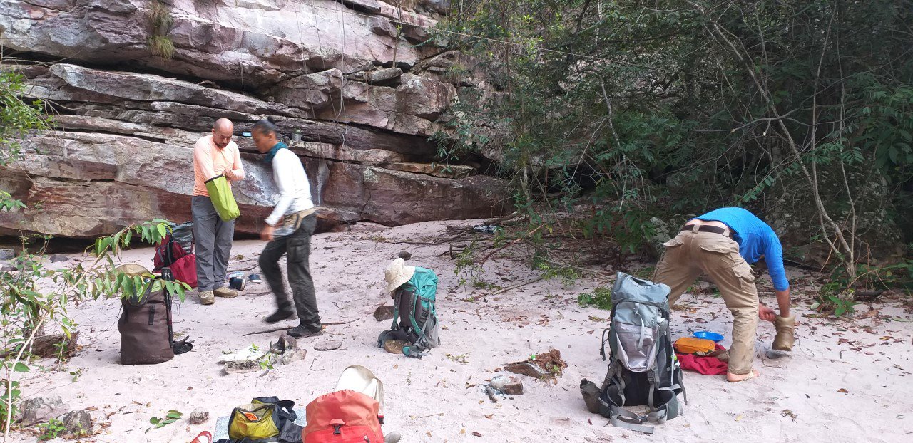 Fomos dormir, cada qual em seu quarto na toca. Durante a noite Samuel levantou duas vezes para fazer remendo no seu isolante. O chão da toca estava repleto de lascas de pedra pontiagudas, que atravessaram a lona e fizeram dois furos no isolante. Antes de dormir havia percebido isto e limpei bem o chão onde colocaria o isolante. Um pouco de mosquitos, mas fiquei protegido por um mosquiteiro. Repelente não funciona muito bem.
