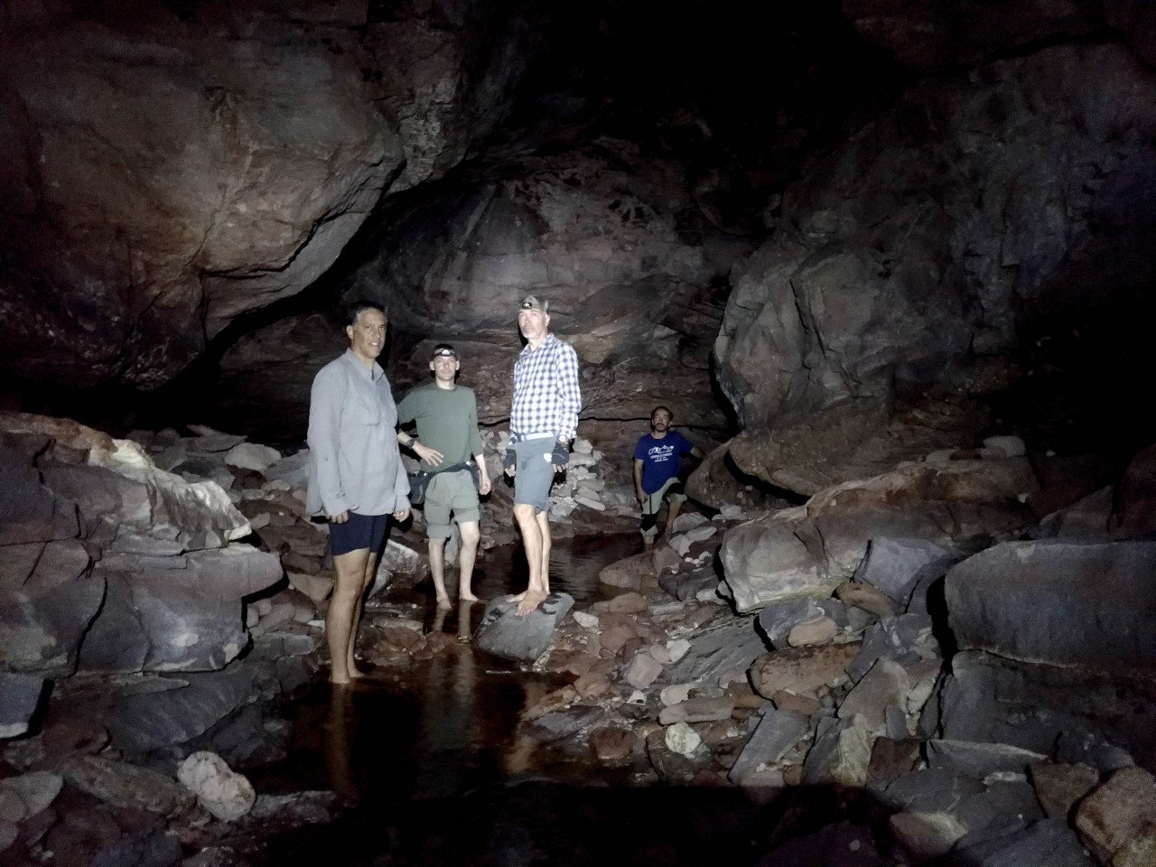 A gruna associada a esta toca estava perto e a visitamos. Foi iniciada pelos antigos que usavam fogo e água para estourar a rocha e, numa geração posterior, foi aumentada com o uso de dinamite. Entramos até o ponto no qual teríamos de avançar de cócoras. A água do córrego em que tomamos banho saia de dentro desta gruna.