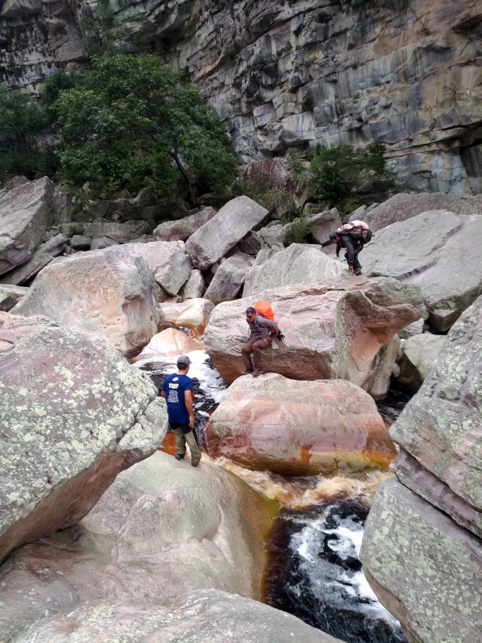 Após a parada do almoço a jornada foi reiniciada. Começou a parte mais dura da trilha, a descida por um leito de rio, através de pedras, algumas gigantescas. Como havia chovido, o rio não estava gatinho, havia bastante água, o que dificultava a passagem.