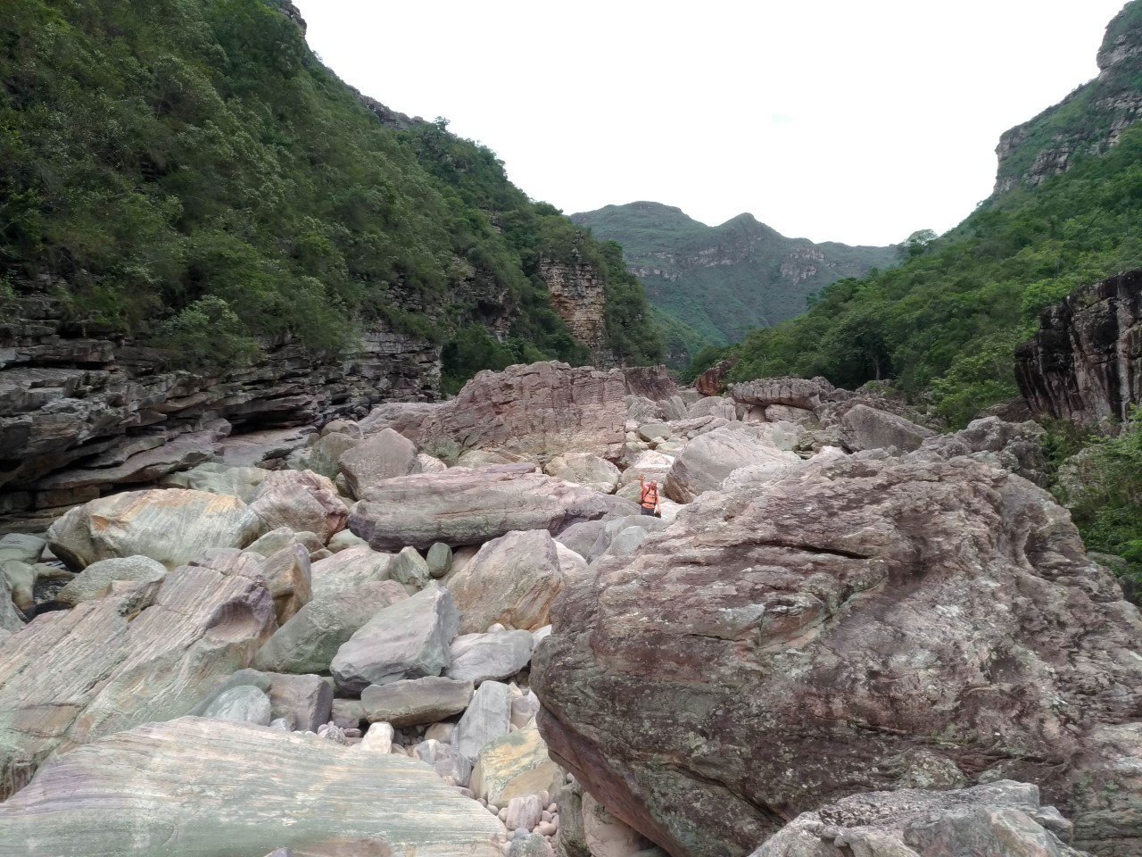 O leito do rio. Este trecho até que não foi difícil...Igor aparece acenando ao centro da foto.