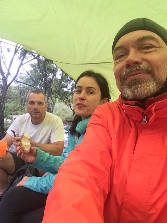 Tomamos nosso café abrigados na minha tarpa, ainda com chuvisco. A tarpa tem esta vantagem sobre a tenda. Dá para modificar seu formato permitido que vire um ponto de reunião e cozinha comum.