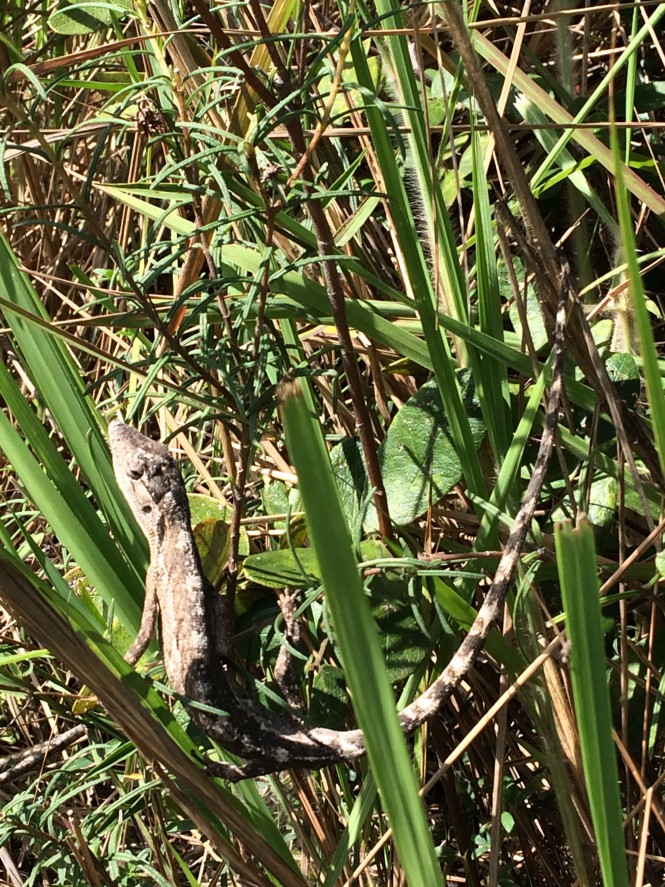 No caminho o Ramon quase esbarra num filhote de camaleão, parecendo um graveto sobre um arbusto, meio que atravessado na trilha.