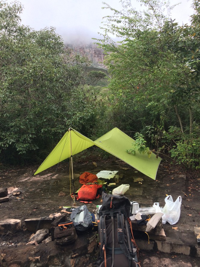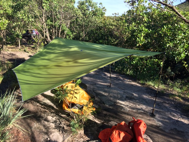 Chegamos na cachu no escuro. Lugar lindo. Uma plataforma de lajes de pedra, chão de um antigo quiosque, serviu como base para nossos abrigos. Armamos eles e preparamos a janta a luz de headlamps.