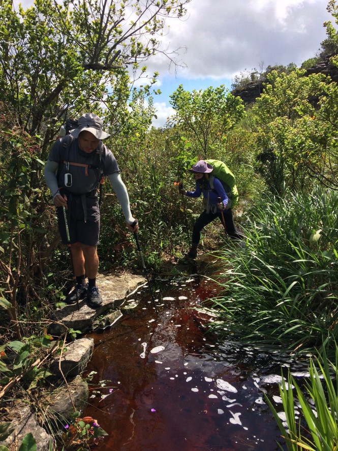 O tempo melhorou pela tarde, com o sol aparecendo entre nuvens, o que permitiu um banho nas piscinas. Resolvemos ficar em Águas Claras e ali montamos acampamento para passar a noite.