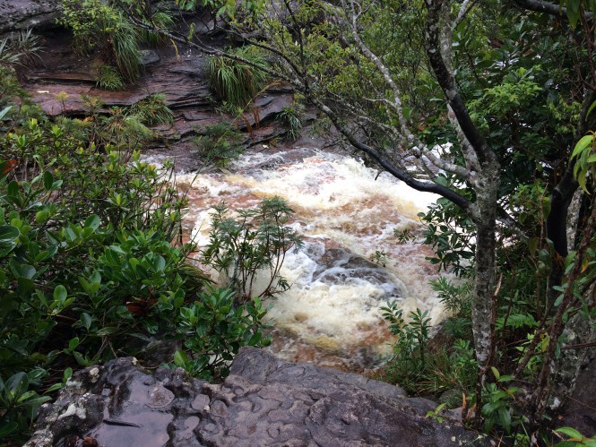 Olha a diferença: o mesmo local da foto acima (onde apareço dentro do caldeirão) após a chuva, vista da margem oposta. O caldeirão foi totalmente encoberto pela água.