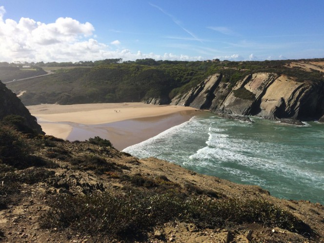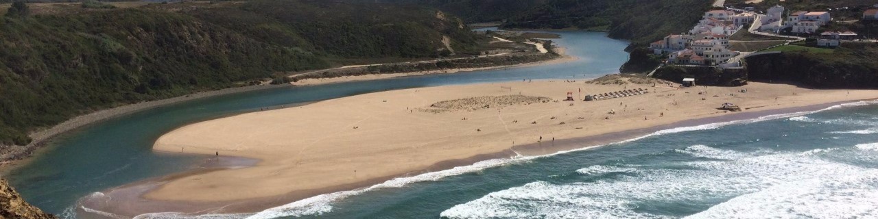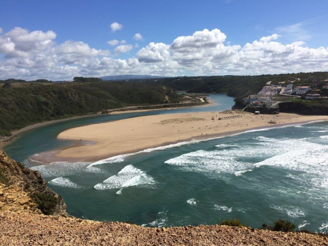 Com mais 30 minutos cheguei a um penhasco com a bela vista da praia de Odeceixe, uma das mais lindas do litoral Alentejano. Ali deságua o rio Odeceixe. É possível escolher entre um banho de mar ou de rio.