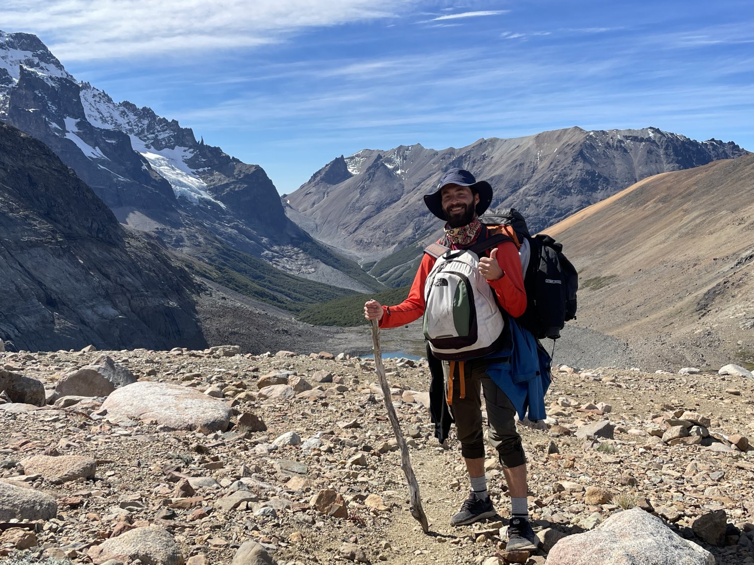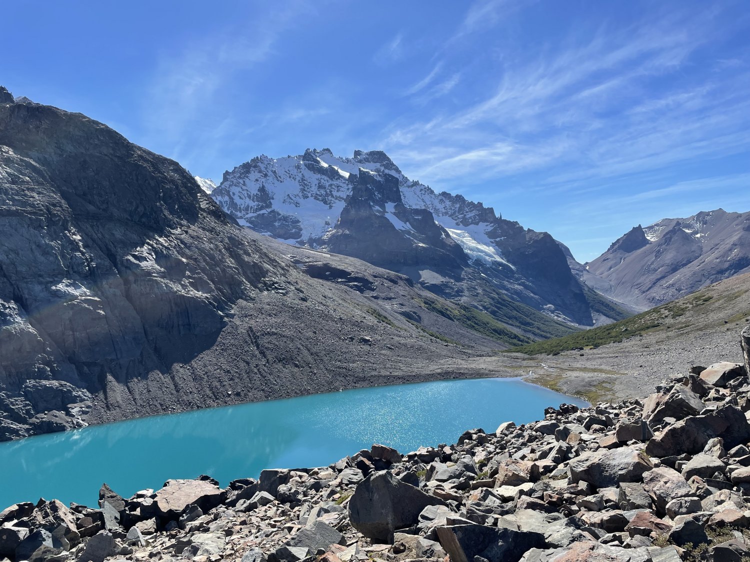 Amanheceu outro dia ensolarado. Partimos para a laguna do Cerro Castillo. Subida fácil. Chegamos cerca de 11 horas e tiramos fotos da bela laguna glaciar. Adam lançou o drone, por isso partimos para o Morro Negro rumo ao acampamento Porteadores antes dele.