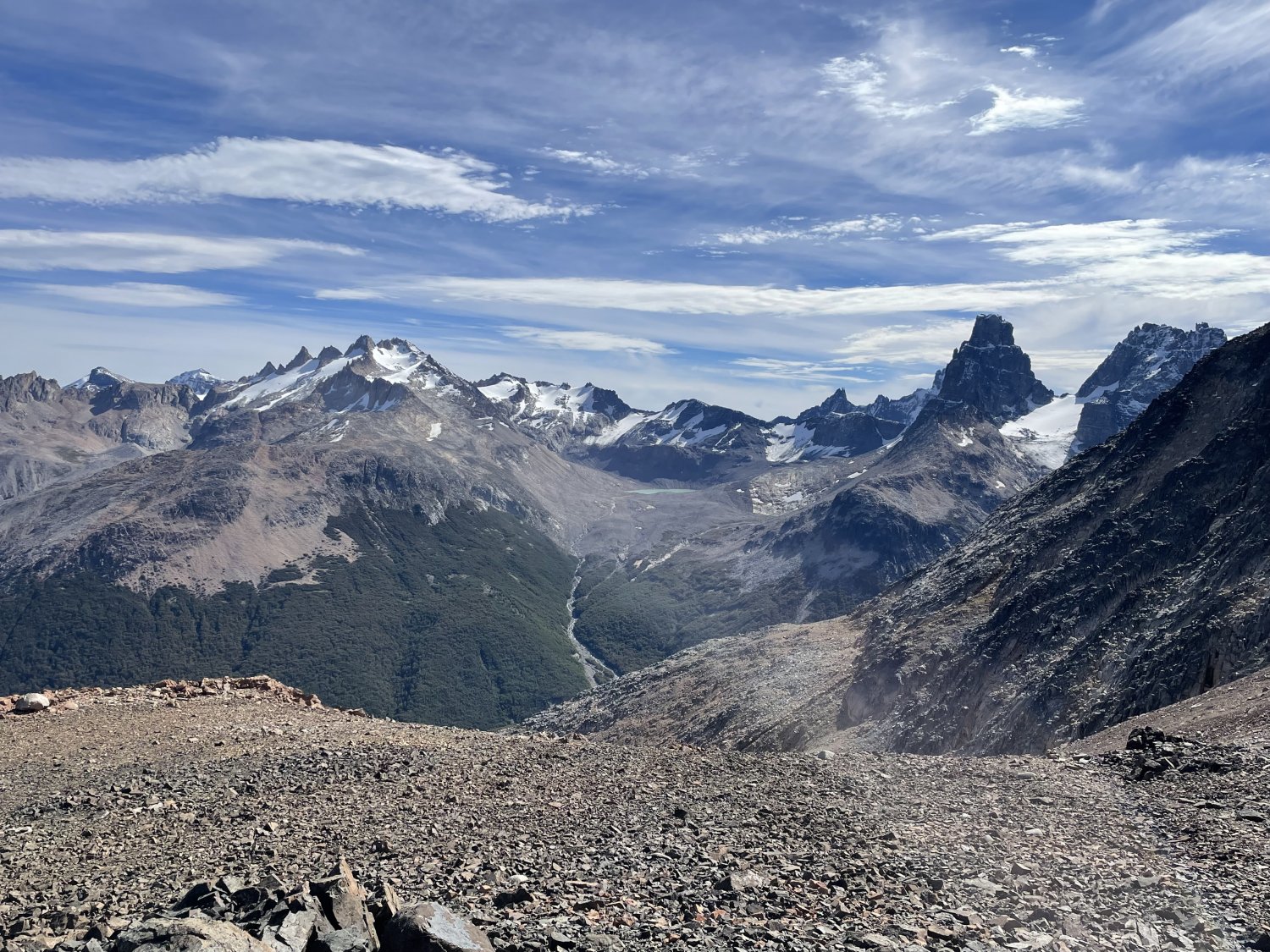 Da crista dava para observar bem as montanhas ao sul. A maior de todas, pela direção e imponência, tenho quase certeza que era o cerro San Lorenzo, 2ª mais alta da Patagônia chilena. Fiquei no refúgio do acampamento base em 2016.
