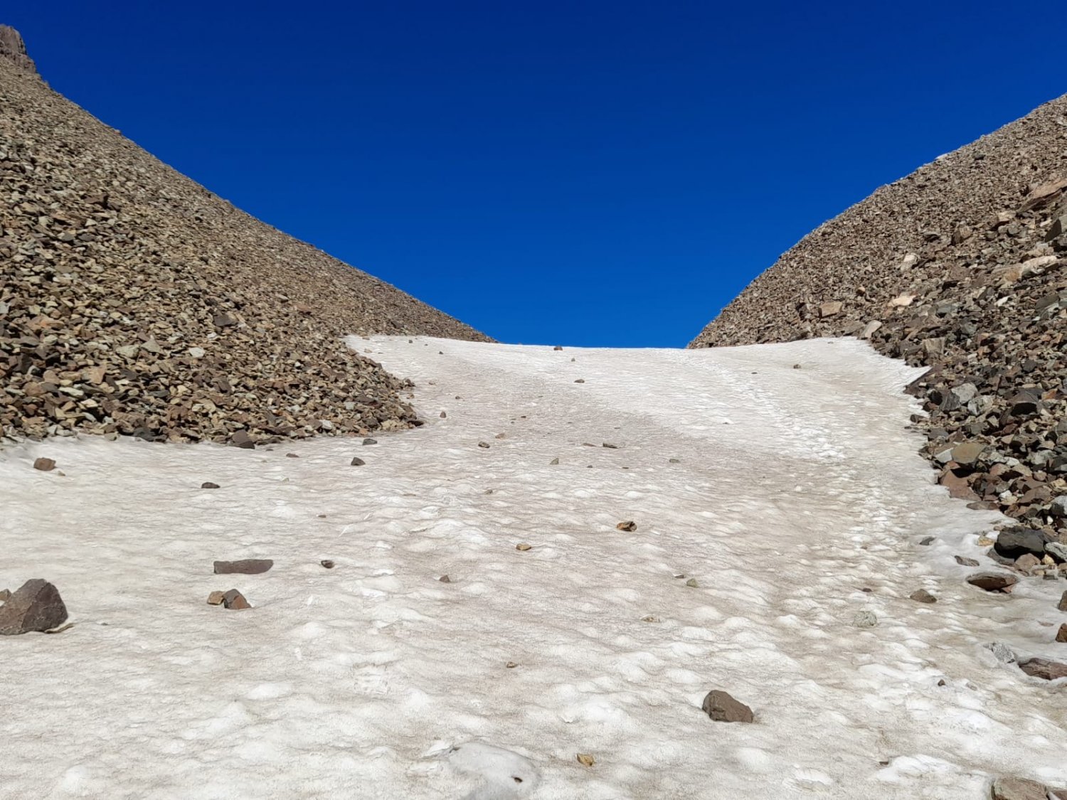 Adam, que saiu mais tarde, nos alcançou já perto do selado. Neste ainda havia alguns manchões de gelo/neve que exigiam algum cuidado na descida. Lucia baixou bem vagarosa pois era sua primeira vez num declive assim. Passos curtos pisando firme com o calcanhar para fazer um mini degrau.