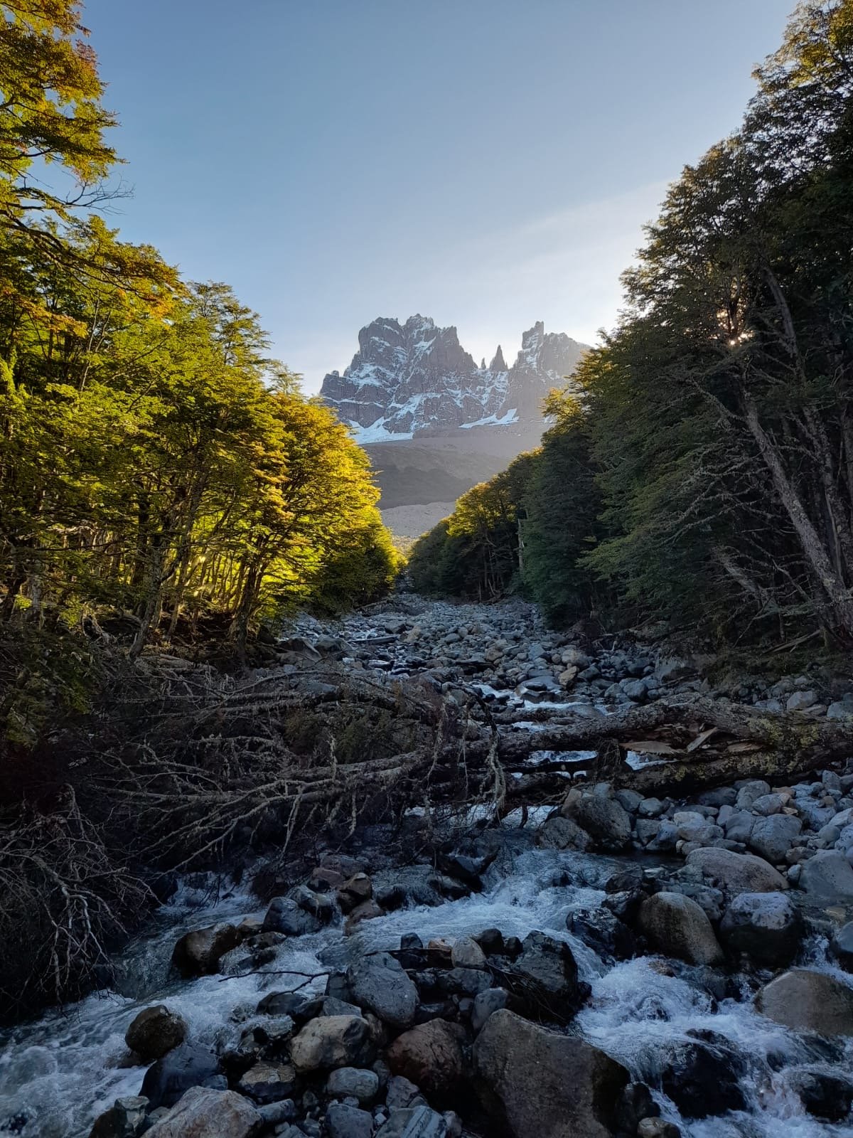 Fica ao lado de um bonito rio que desce a montanha. Se baixar para o rio, onde buscávamos água, é possível ver o belo Cerro Castillo entre as árvores.