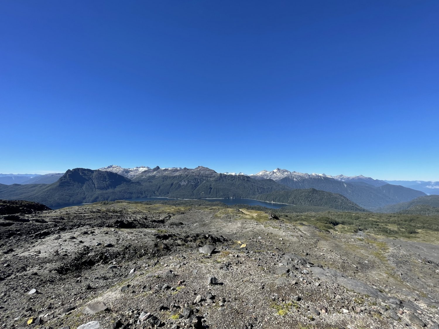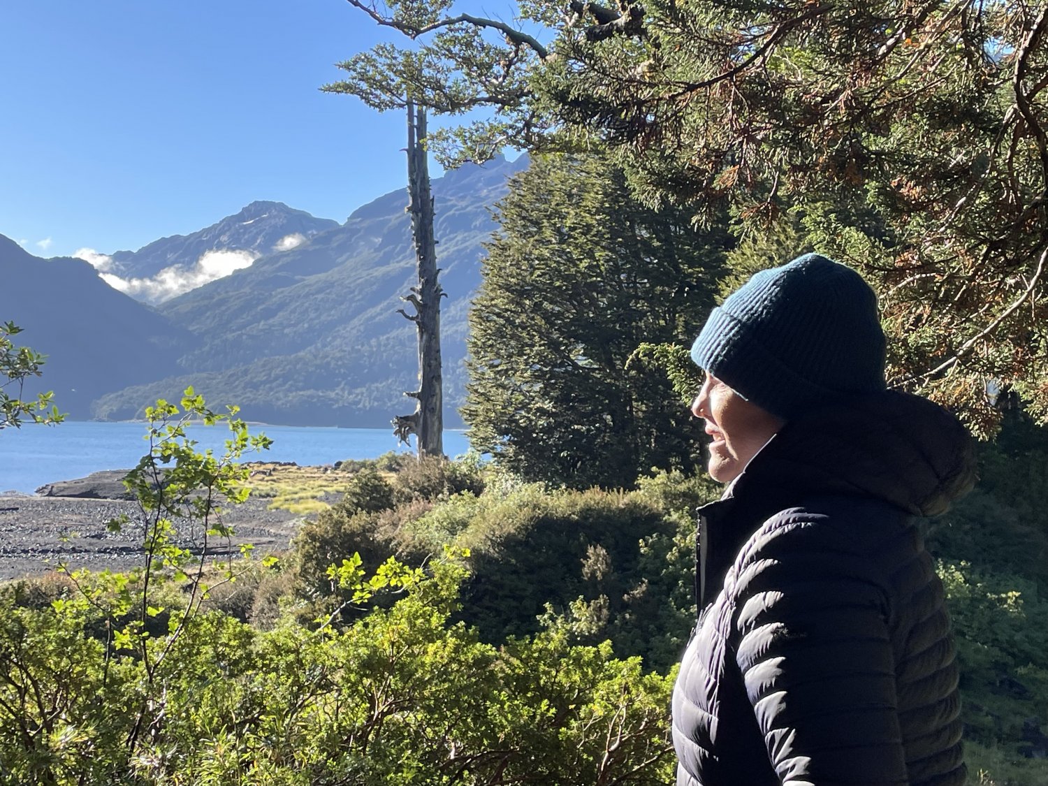 Dava para ver a cidadezinha de Hornopirén a Oeste, a beira do mar (centro, ao fundo, logo atrás de mim). Foto da Cris.