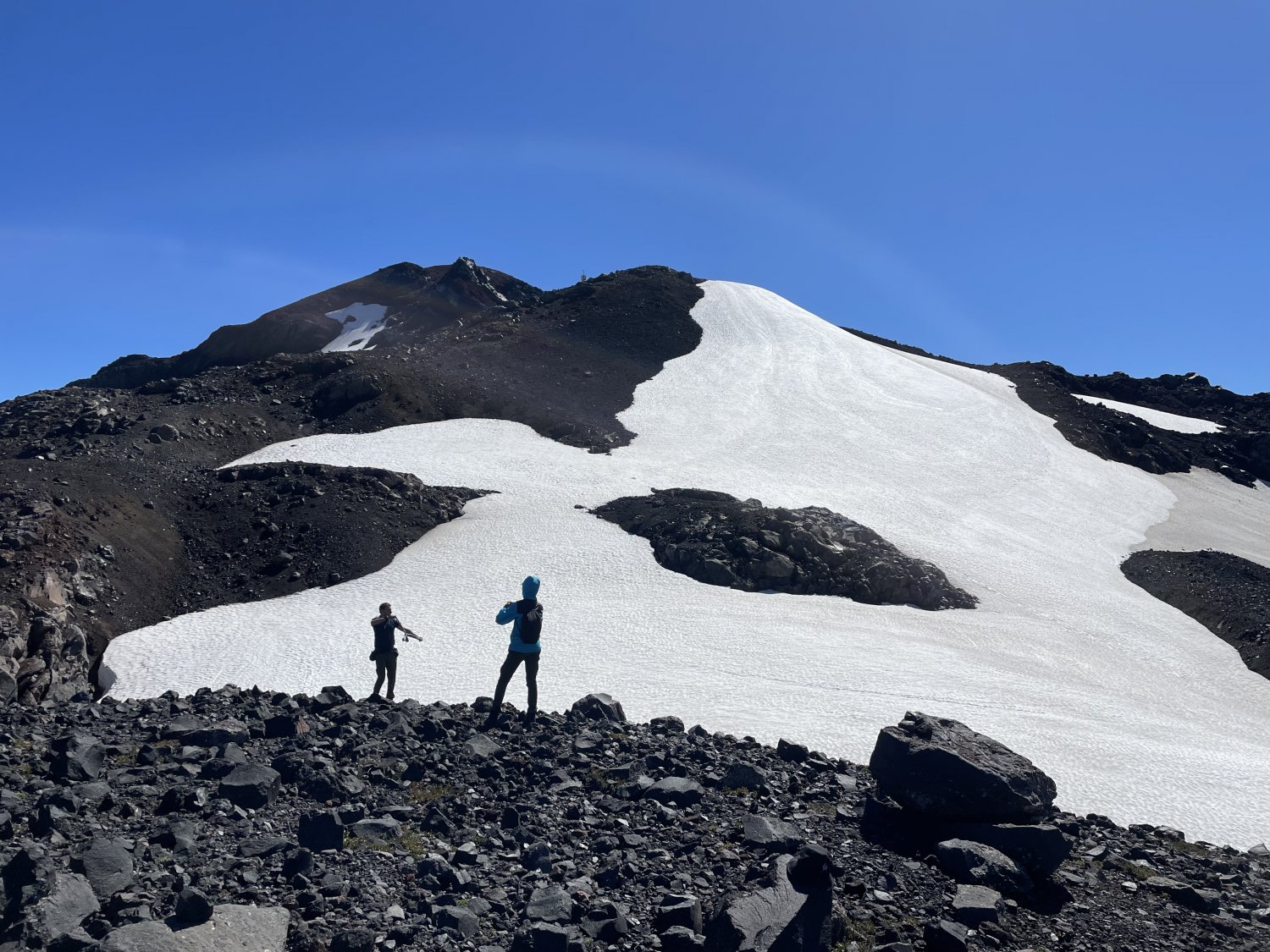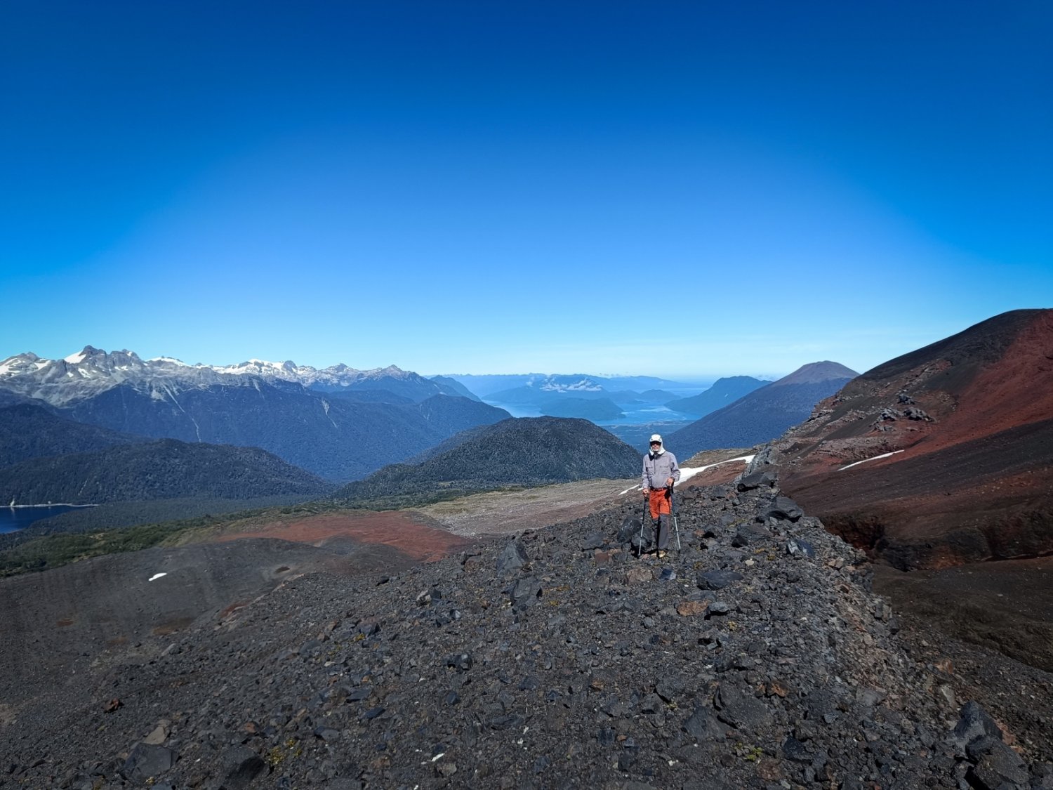 Chegamos no mirante com hora e meia de esforço. Não era o cume, que ficava mais afastado, sobressaindo de uma grande geleira da qual podíamos ver algumas gretas. O cume do vulcão Yates por este lado é uma ascensão técnica, haviam algumas geleiras cuja progressão segura exigia piolet e crampons. Bom lugarzinho para acampar num treinamento de alta montanha. Água, só derretendo gelo.