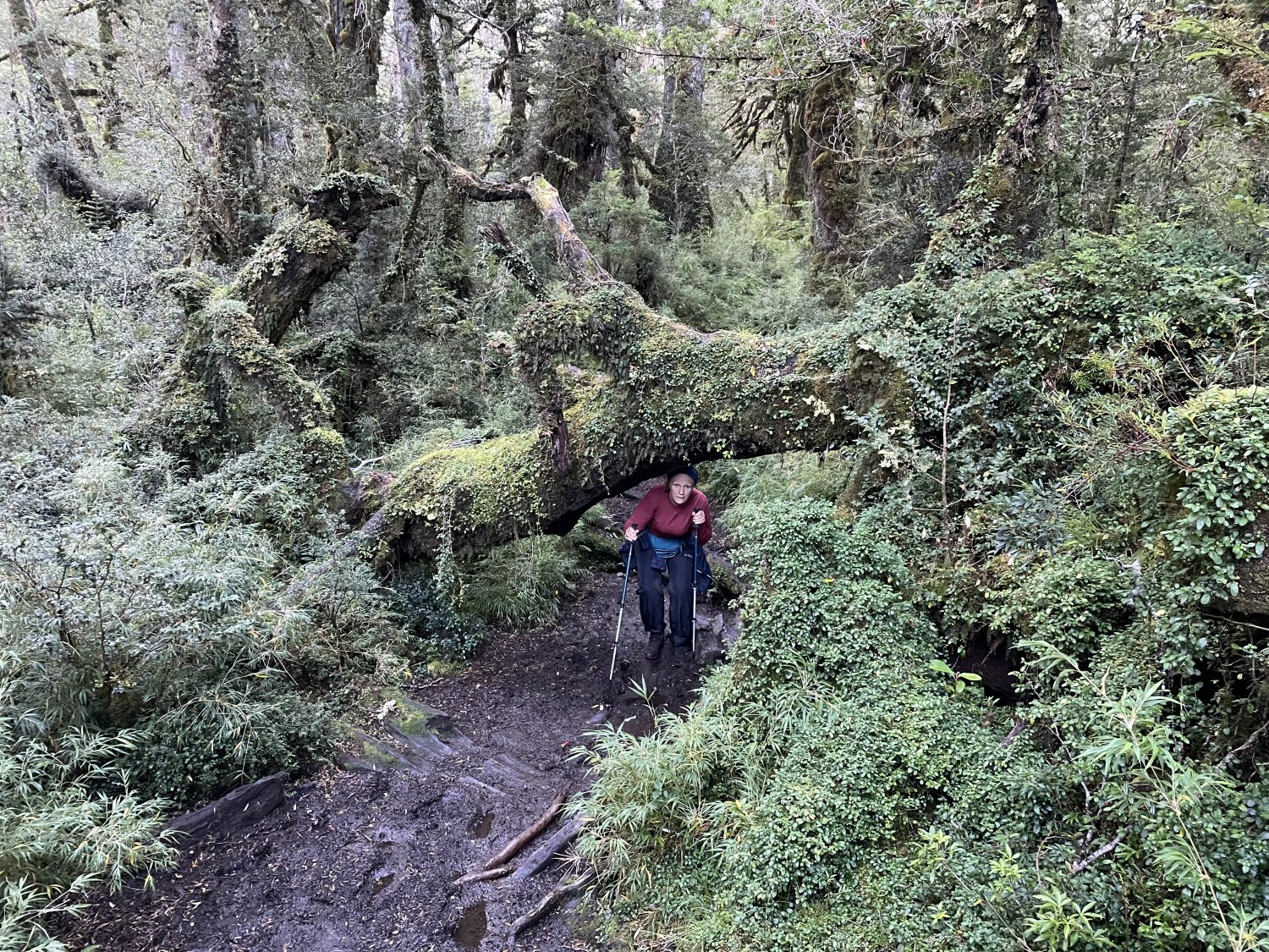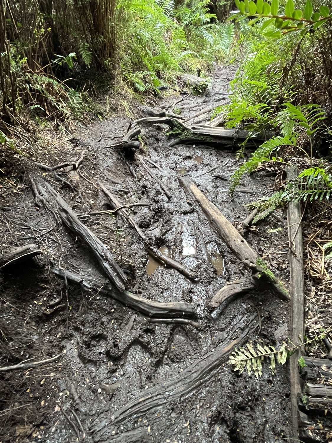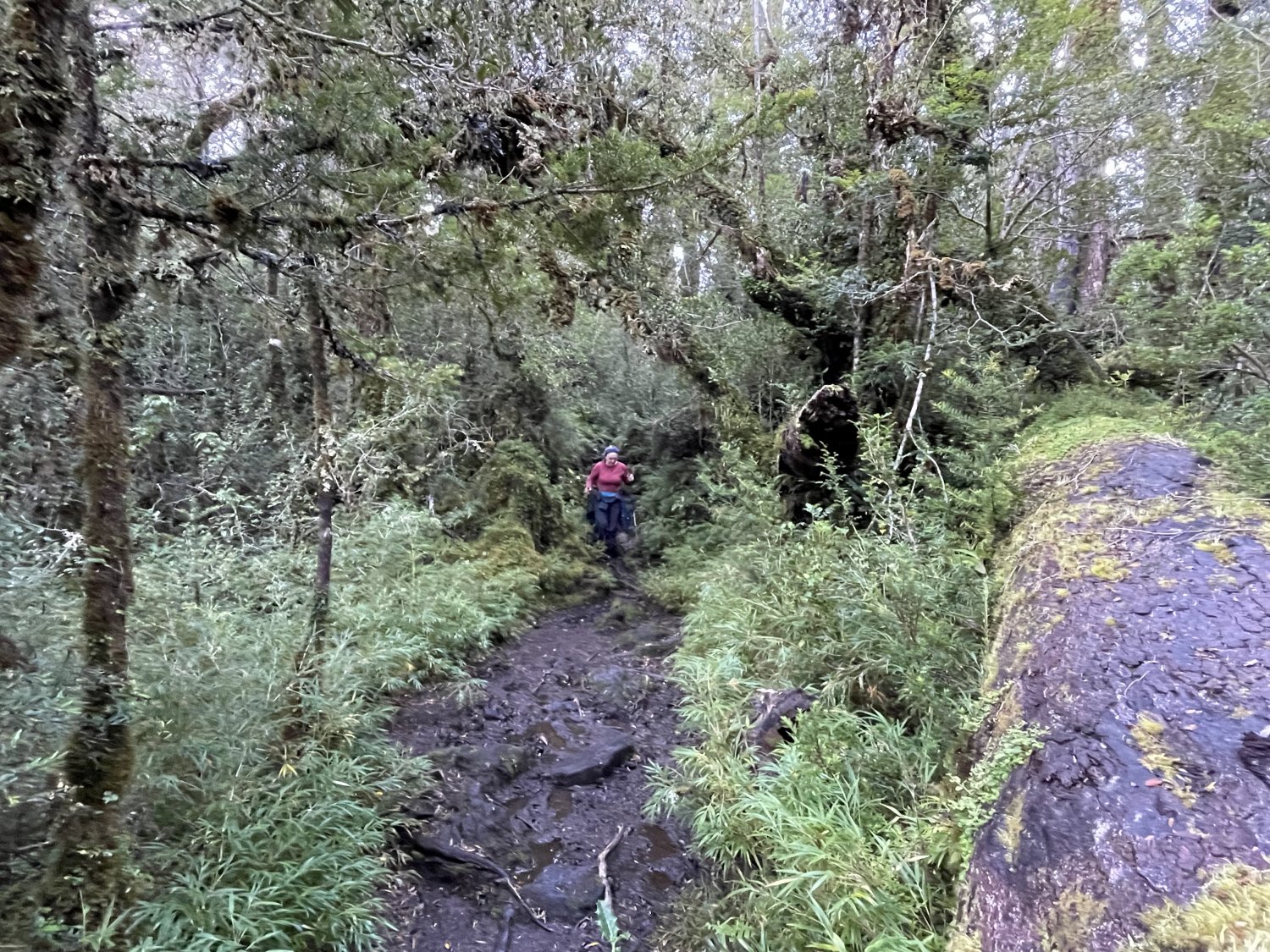 O sendero segue direto por área sombreada de floresta. Aquele lameiral deve levar muito tempo para secar. Não sabe o que é uma rara "floresta temperada pluvial"? Visite o PN Hornopirén!