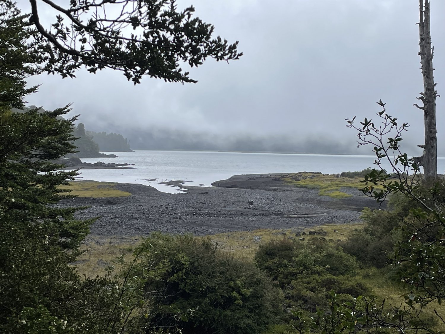 A chuva e o frio tem o seu charme. Lago Pinto e Concha, com sua praia de areia e pedras vulcânicas.