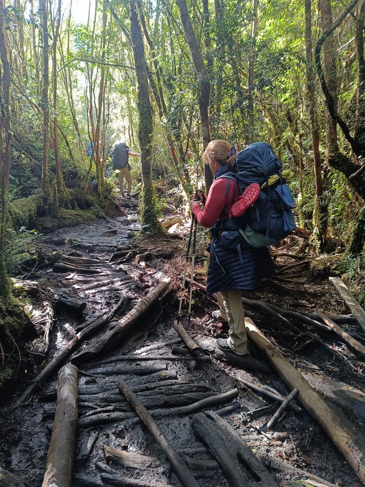 A trilha começava bem, atravessando um belo rio numa ponte pênsil, seguida de troncos dispostos no chão e passarelas para evitar a lama.