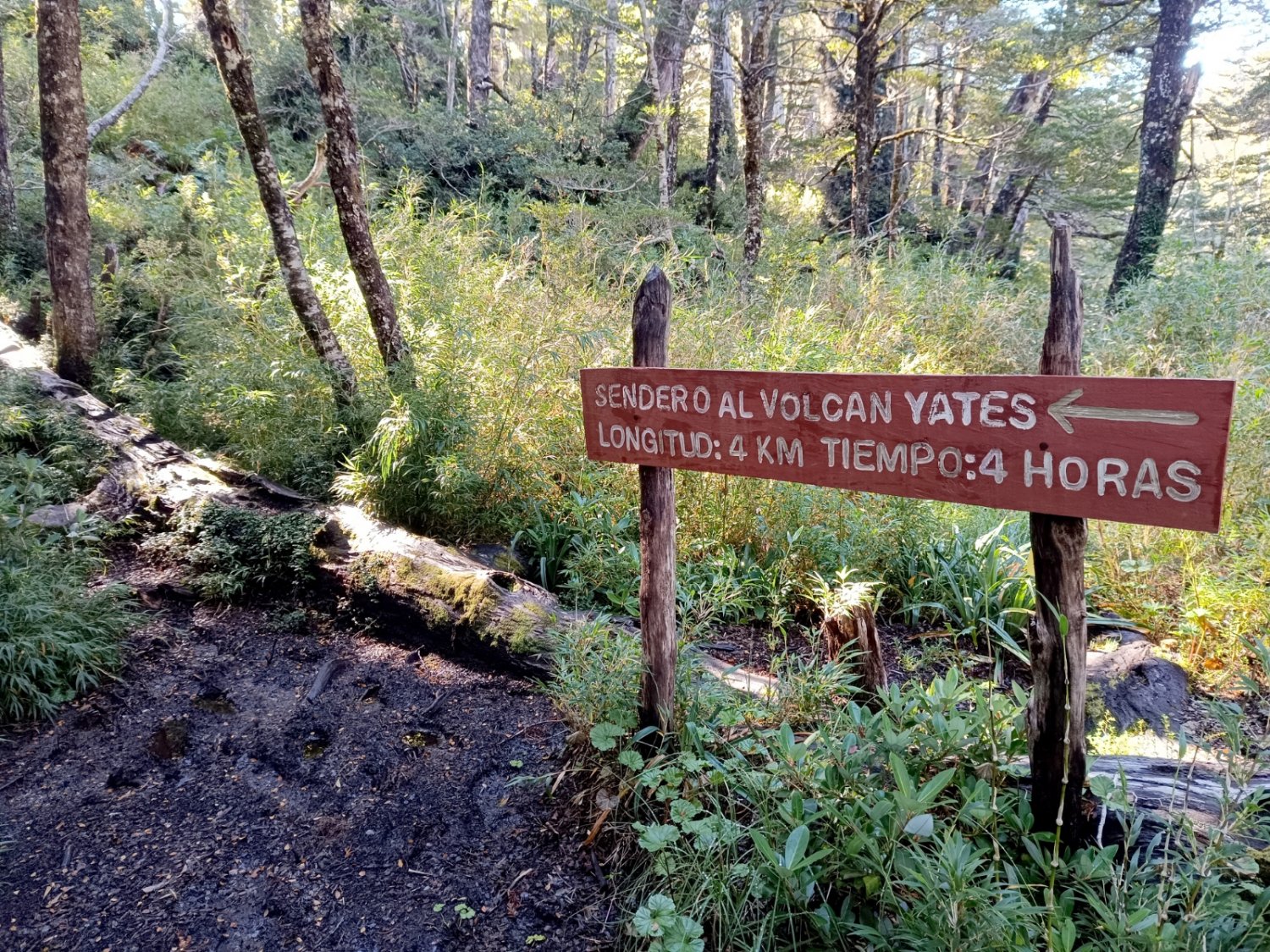 Eu, Cris e Fabio decidimos subir até o vulcão. Lucia preferiu ficar no acampamento. A placa indicava 4 horas de caminhada.