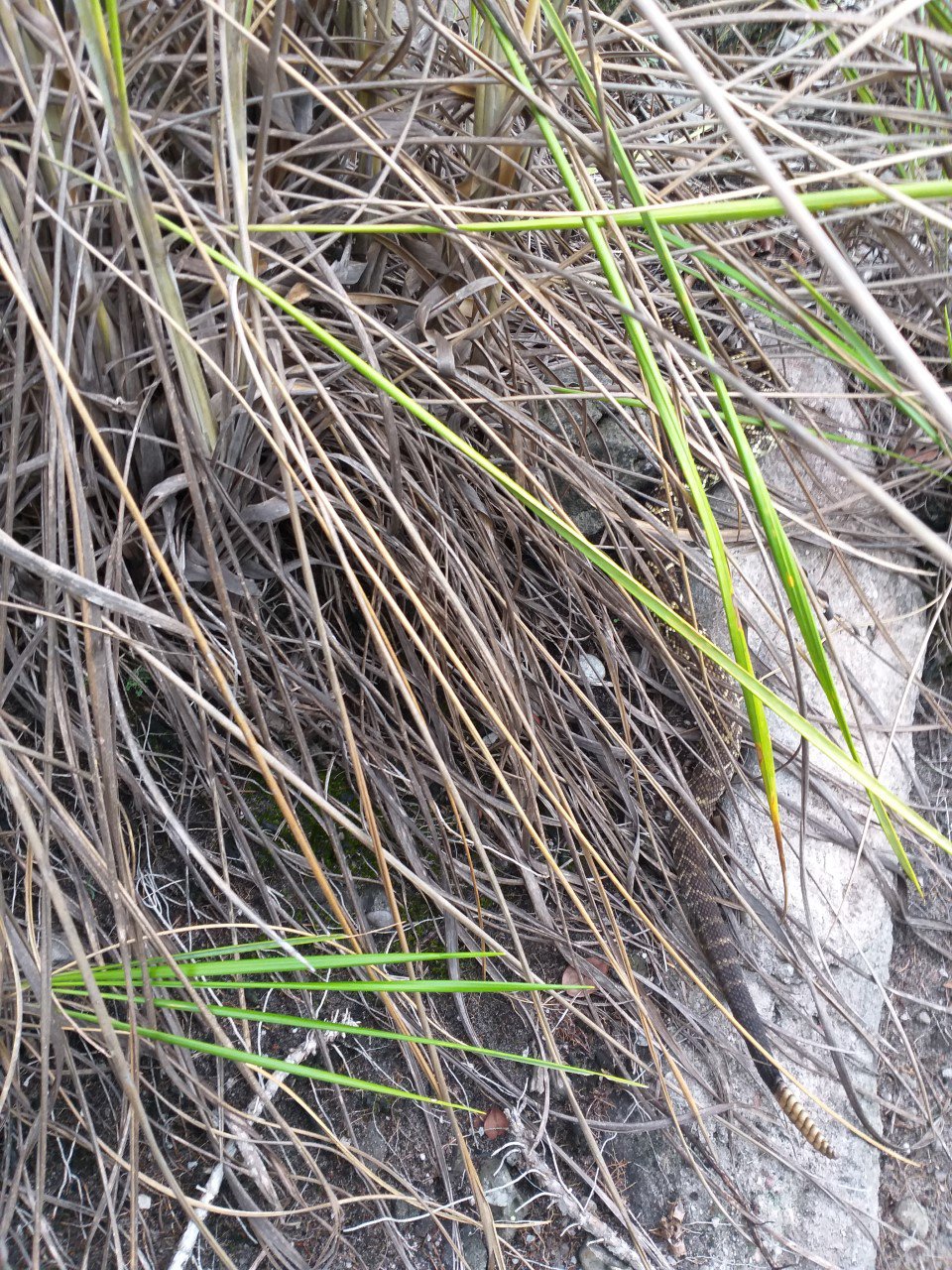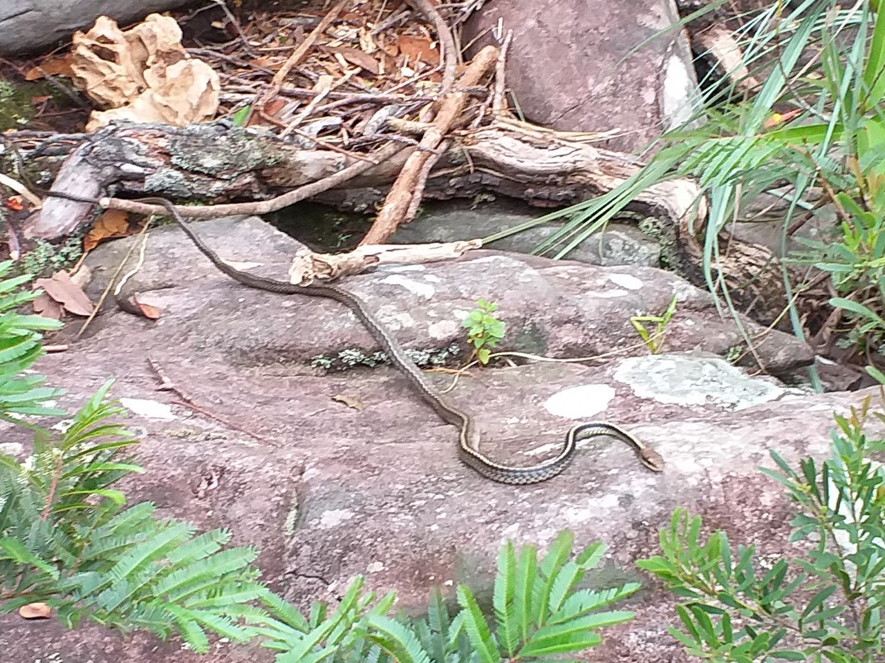 Logo na saída, uma cobra cipó no caminho. É uma cobra muito ágil, mas não é agressiva. Tivemos que contorná-la antes que desaparecesse sob uma pedra.