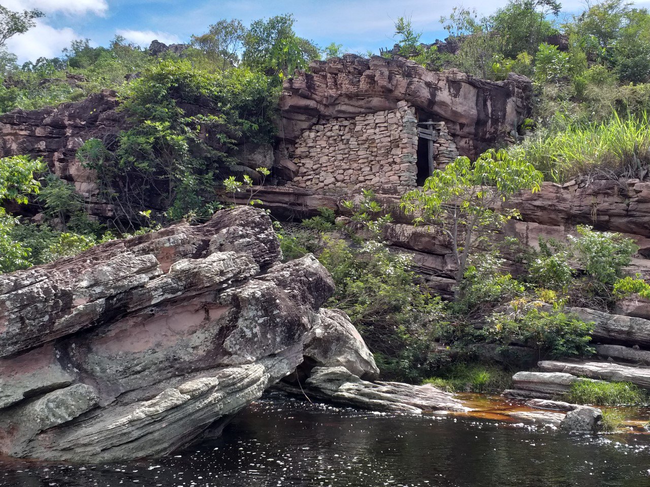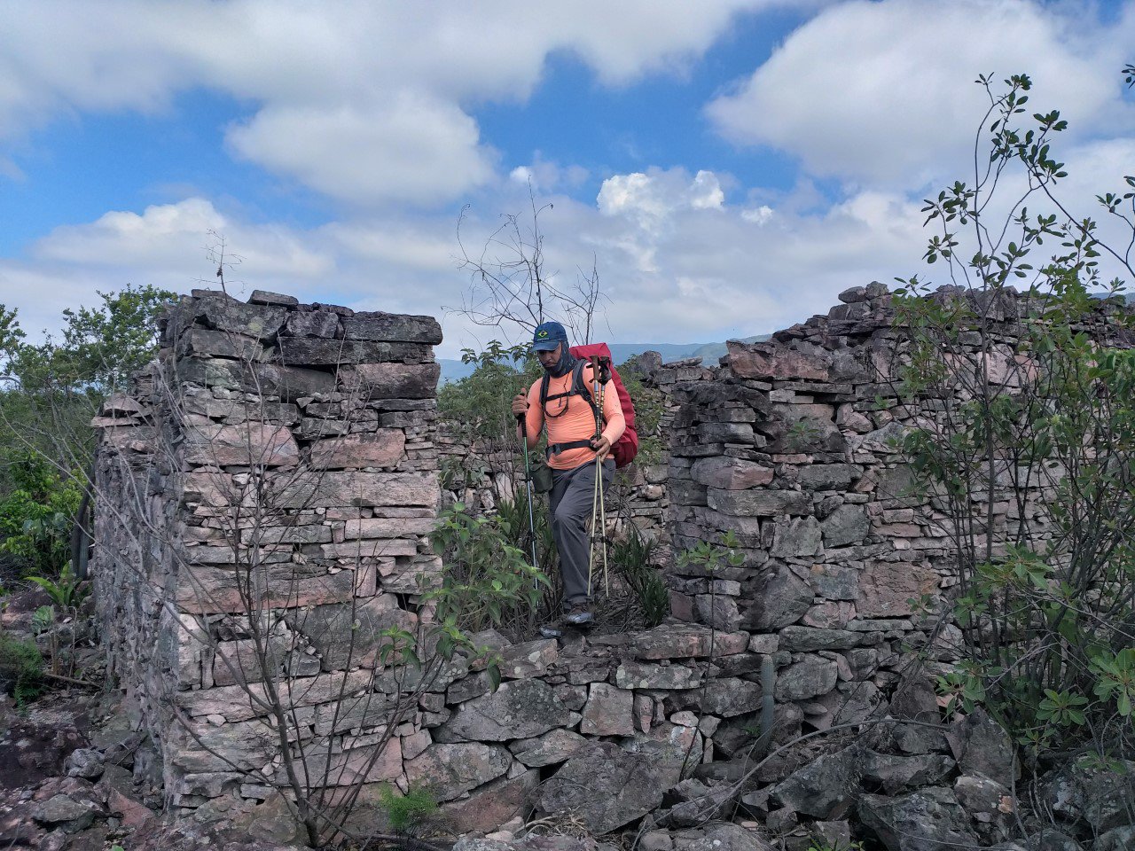Perto do topo da serra o caminho ficou pedregoso e sem sombra. Suamos até chegar num platô de lajes de pedra, onde é difícil enxergar qualquer trilha. Seguimos rumo sul onde avistamos uma antiga casa de pedra sem telhado, da época do garimpo.