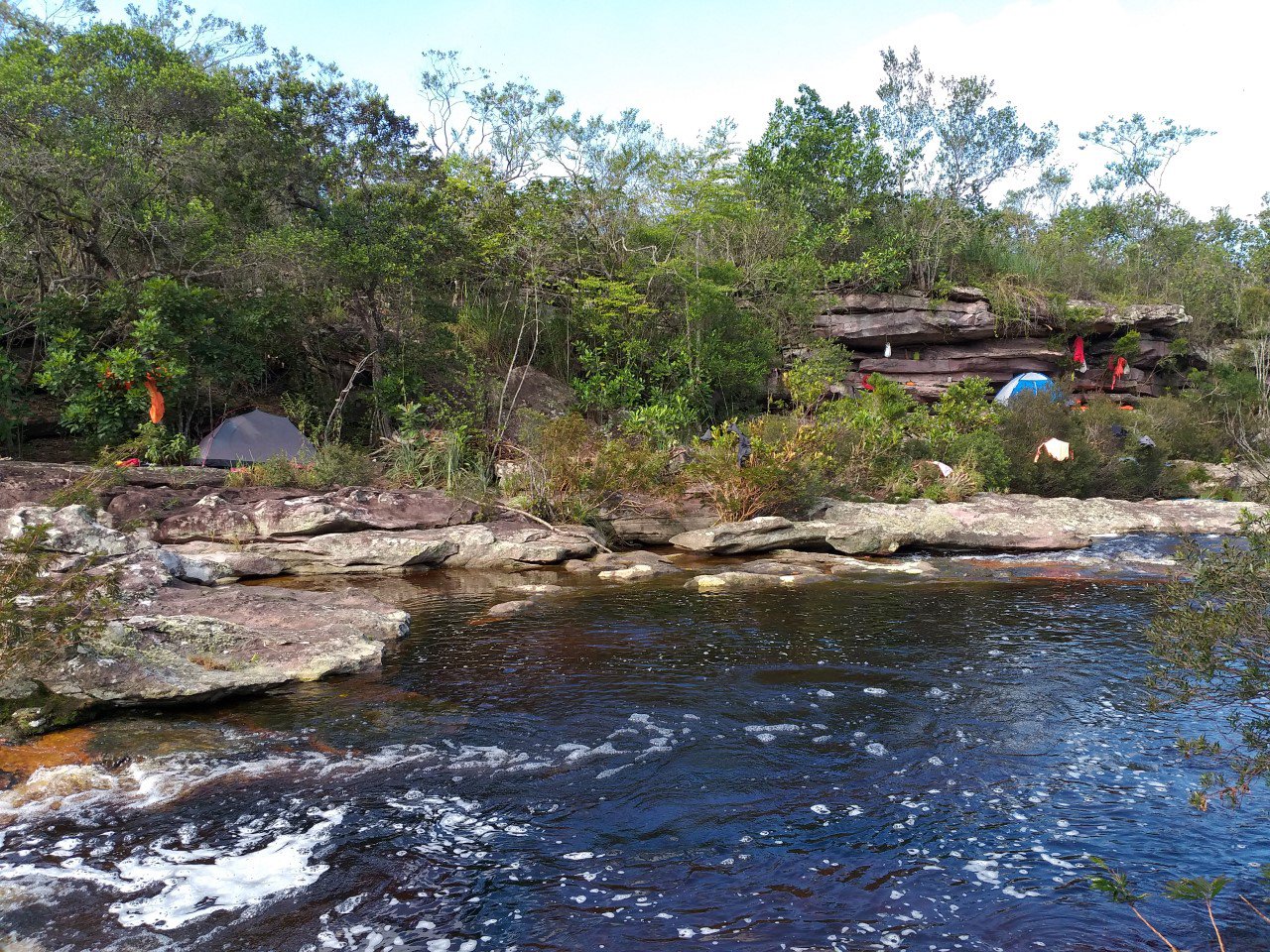 Eu bivaquei e Alex e Igor compartilharam uma tenda, montada na laje/toca do Caldeirão. Como não havia espaço com o chão plano, Samuel e Lucinha montaram a tenda deles um pouco mais distante, rio acima.
