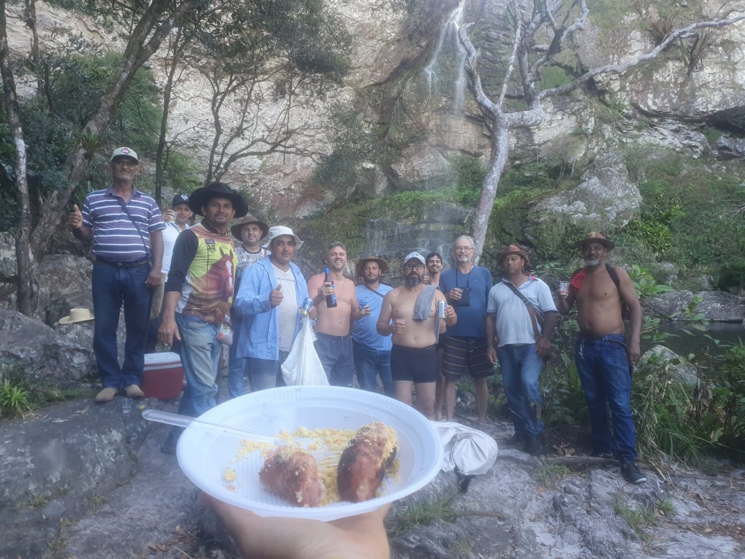 Apareceu um grupo grande, cerca de 10 pessoas da região. Visitavam a cachoeira e fizeram linguiça assada numa fogueira. Muito gentis ofereceram cerveja. Ao final, nos deram uma garrafinha de vodka, um resto de licor de gengibre, um pote de margarina cheia até a metade com mel (haviam colhido numa colmeia selvagem no caminho) e limões. Providencial porque esquecemos nossa cachaça!