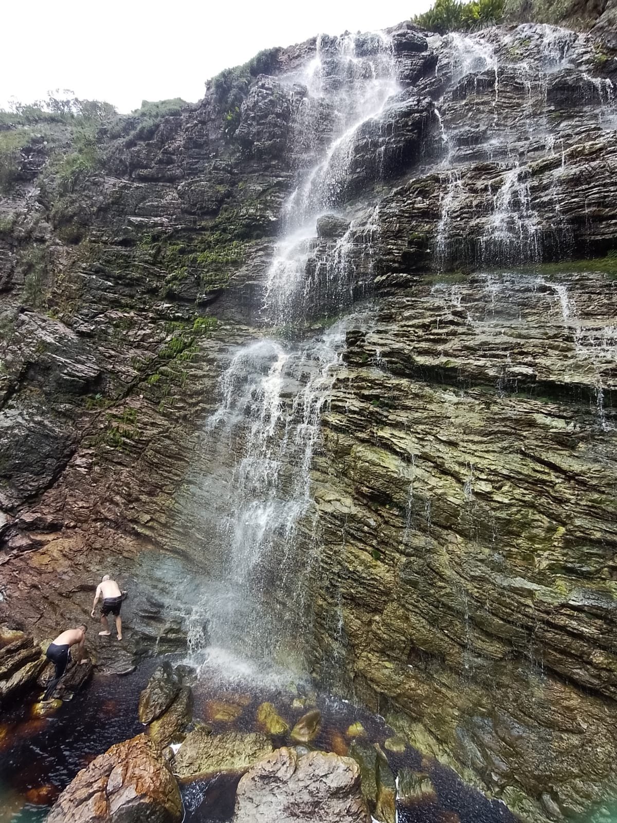 A cachoeira tinha bem menos água que no começo de dezembro. Mas estava muito bonita porque a queda batia nas rochas e subdividia em outras quedas dando um efeito de chafariz.