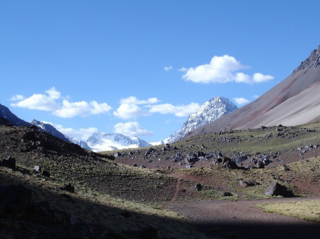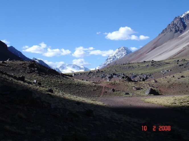 O vale tem uma inflexão para a esquerda de quem sobe, ao lado do cerro México e continua ascendendo. Embora a 1ª etapa tenha apenas entre 11 e 12 km, 500 mts de desnível, e 5,5 horas de caminhada até o abrigo Las Minas, o fato de ter vindo de ônibus de Mendoza, saído dos 800 mts de altitude para os 3.100 mts em apenas 4,5 horas, deixou-me pouco aclimatado tornando o 1º dia difícil.