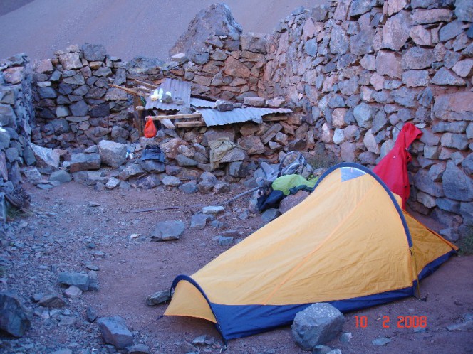 Por volta de 17 horas estava já olhando de soslaio para ver se encontrava um bom lugar para acampar, devido ao cansaço. Nada de encontrar o abrigo Las Minas. Até que, de cima de um morro, avistei ao longe uma forma retangular entre umas pedras grandes num morro adiante. Não dava para distinguir se era pedra ou uma construção humana. Mas o formato pouco comum na natureza me deu esperança de ser o abrigo. Quando me aproximei vi que se tratava do que restou de uma construção, provavelmente uma casa de mineiros. Apenas as grossas paredes de pedra estavam de pé. Dentro, num canto, um pequeno abrigo feito com folhas de flandres. Ali era a cozinha. Armei a tenda dentro dos muros. É um excelente abrigo em relação aos ventos. Se vc não tem muita confiança na resistência da sua barraca a ventos fortes, ali dá para ficar tranqüilo...Havia água translúcida num pequeno córrego que brotava da terra mais abaixo. Pelo mapa topográfico, este local está entre 3.500 e 3.600 metros.