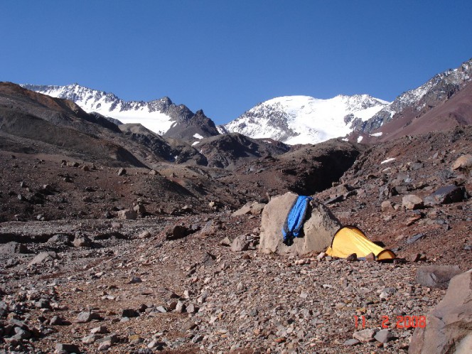 Fiz acampamento ao lado de um grande boulder, num campo de pedras. Havia um pequeno cercado de pedra onde outros acamparam ou fizeram sua cozinha. Rapidamente compreendi que as pedras daquele campo desceram rolando da montanha, no caso, do Pan de Azucar. Embora estatisticamente seja pequena a probabilidade disto ocorrer sempre fica a preocupação. Geologicamente estas montanhas e vales ainda são muito ativos. Nos Andes há toda uma história de deslizamentos e avalanches que arrasaram casas ou vilas inteiras.