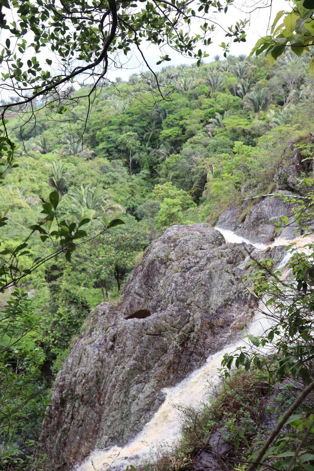 Visitei ainda o topo da cachoeira para mais fotos. Visão bonita do belo vale em que fica a queda d’água. Embora seja proibido acampar (o local é uma RPPN) vi indícios de acampamento.