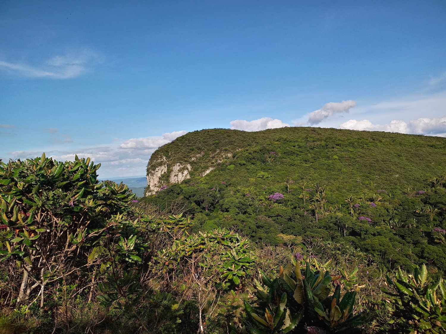 Percorremos um bom trecho numa encosta com vegetação rupestre. Ela era voltada para leste e avistamos os cânions de rios que desciam a serra daquele lado. Muita mata, a floresta entremeada com árvores floridas de roxo, as quaresmeiras. Muito belas as vistas.