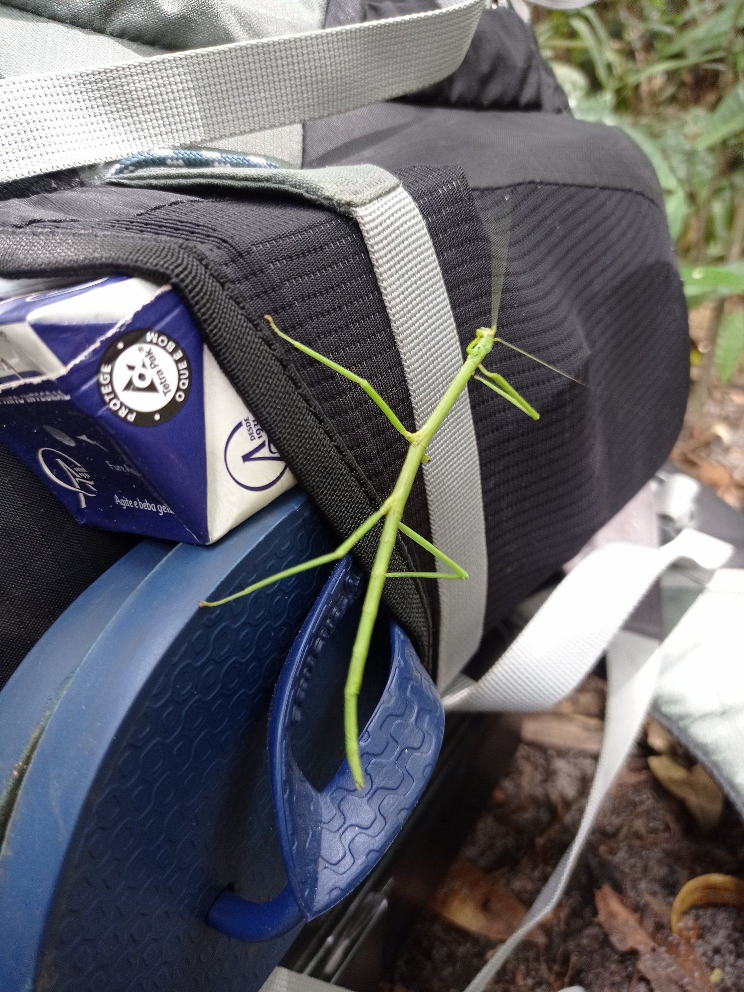 Num ponto paramos para pegar água no riacho. Um bicho-pau aproveitou para inspecionar uma mochila. Foto de Cris.