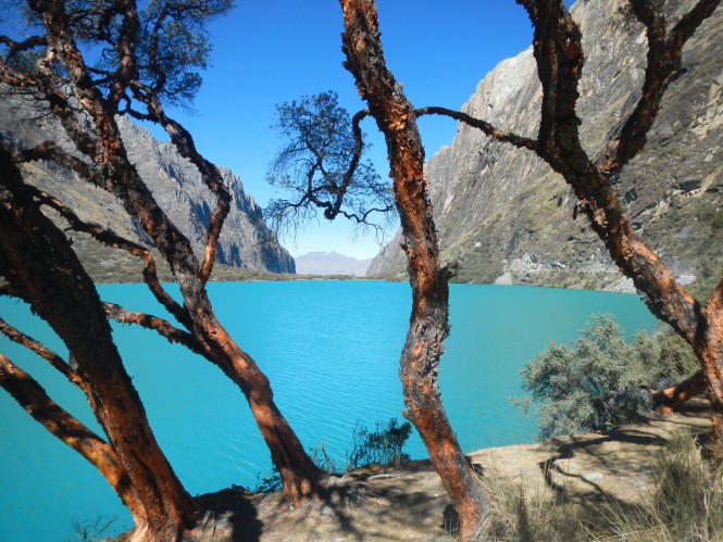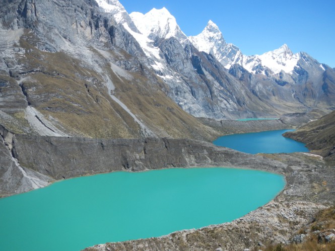 Contornamos a laguna pela margem sul e entramos numa quebrada onde ficavam as 3 lagunas, Gangrajanca, Siula e Quesillococha. Descansamos e lanchamos na última. Em seguida veio o Passo Siula, 4.834 m, bem íngreme, o mais cansativo de todo o circuito. De cima de um mirante tiramos as fotos clássicas das 3 lagunas. Linda paisagem.